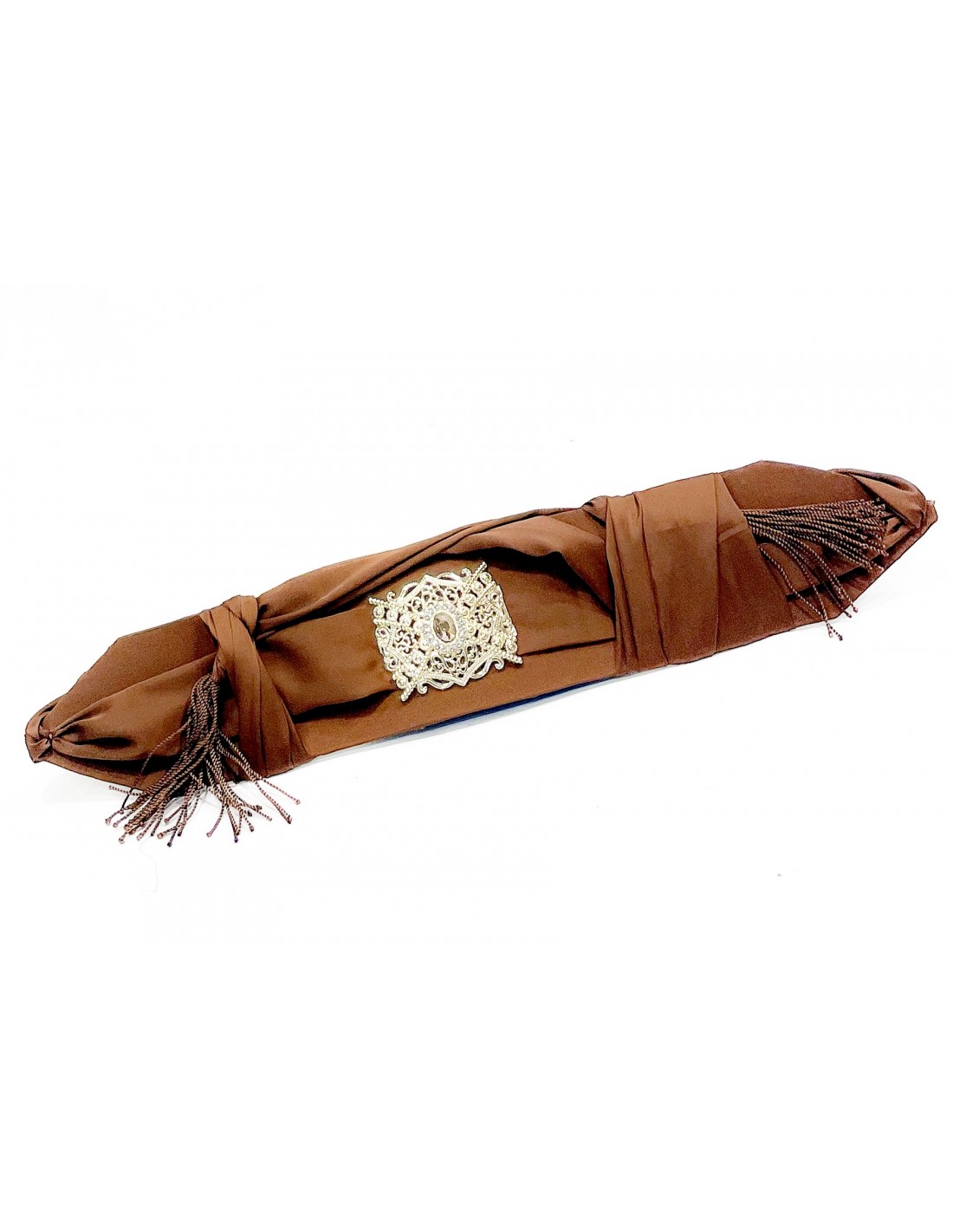 Sublimez votre tenue avec cette somptueuse ceinture orientale en satin marron, idéale pour accompagner un caftan, une takchita ou une robe traditionnelle. Confectionnée avec un tissu soyeux et fluide, elle est ornée d’une boucle dorée finement travaillée, agrémentée d’une pierre scintillante qui ajoute une touche de raffinement et d’élégance.