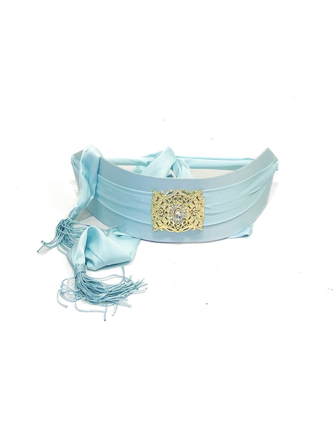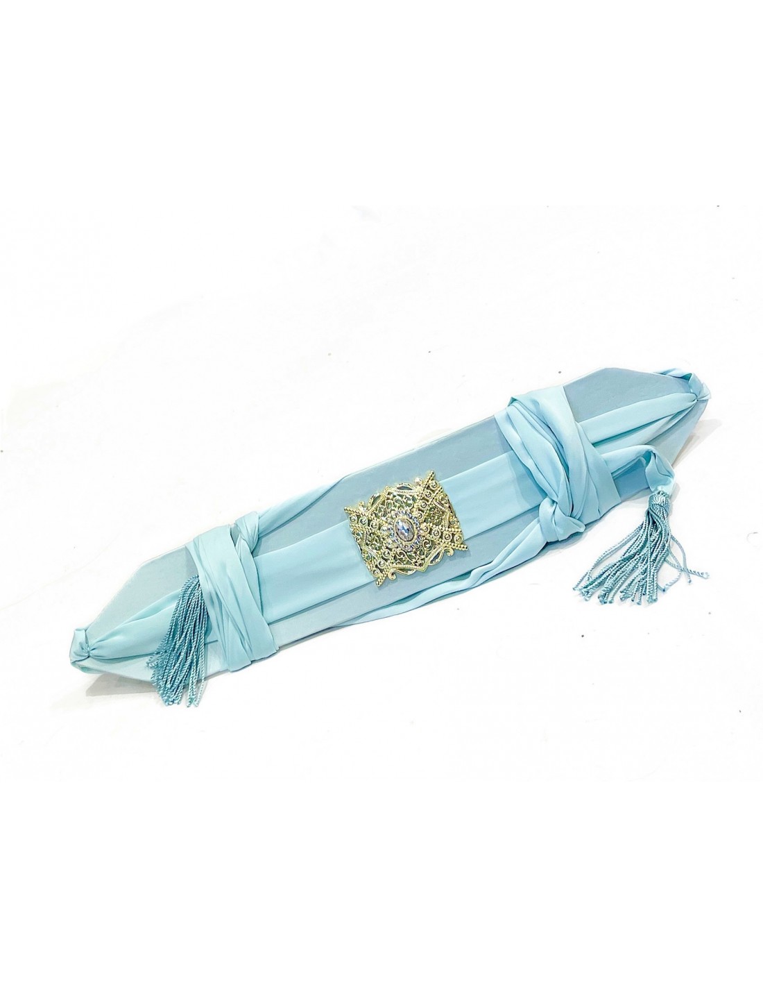 Apportez une touche de raffinement à votre tenue avec cette magnifique ceinture orientale en satin bleu ciel, conçue pour sublimer un caftan, une takchita ou une robe traditionnelle marocaine. Son tissu en satin fluide et élégants’associe parfaitement à sa boucle dorée finement ciselée, ornée d’une pierre scintillante bleutée, ajoutant une allure majestueuse et sophistiquée.