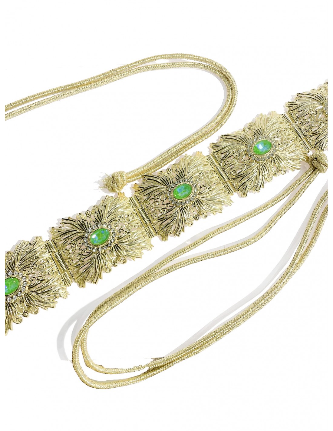 Cette somptueuse ceinture dorée est une pièce d’exception qui marie élégance et raffinement. Elle est composée de plaques finement ciselées, formant un magnifique motif floral et baroque. Chaque segment est orné d’une pierre verte turquoise éclatante, apportant une touche de couleur et de prestige à l’ensemble.