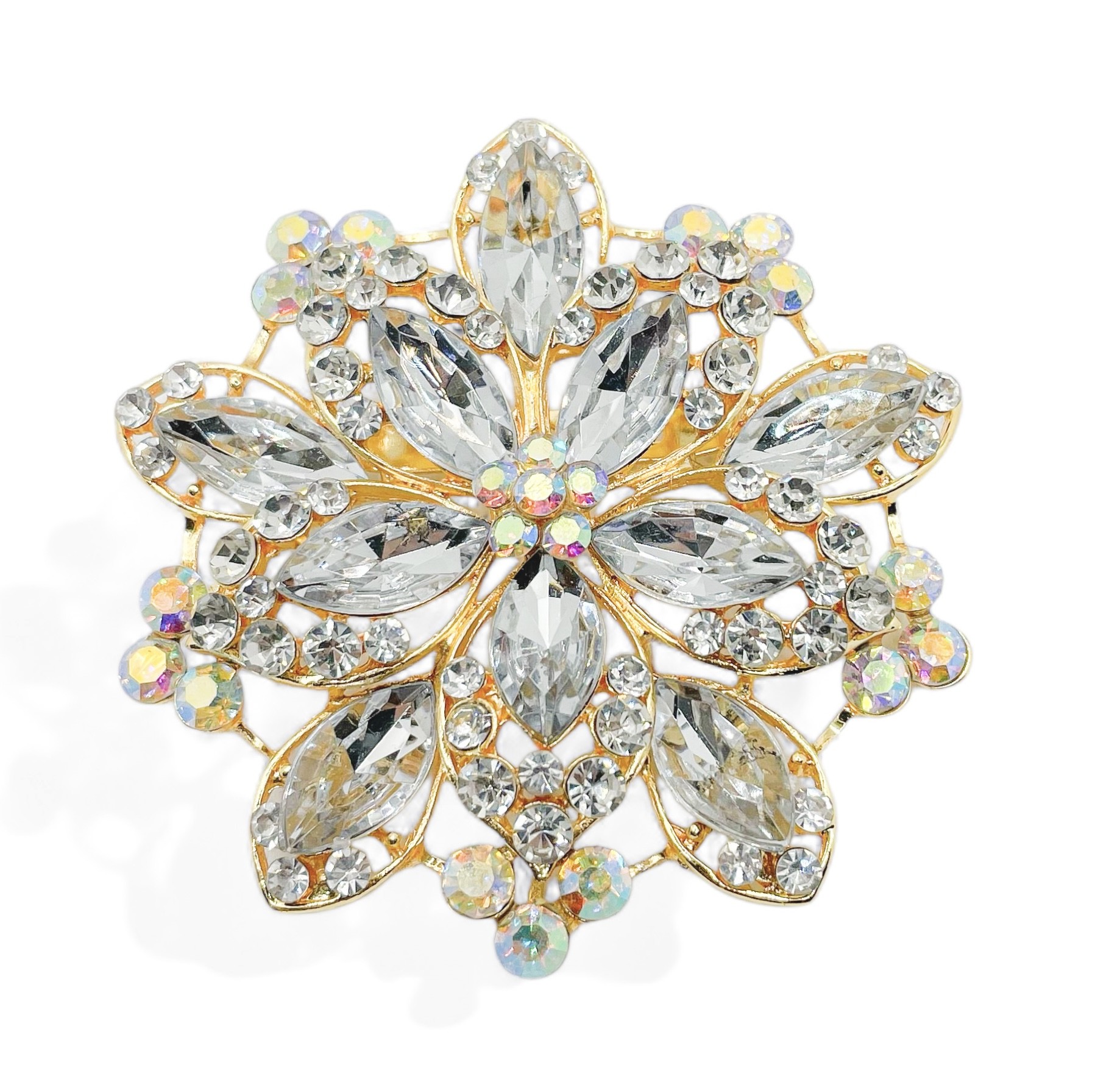 Broche fantaisie forme ronde, sertie de strass doré et pierre blanches