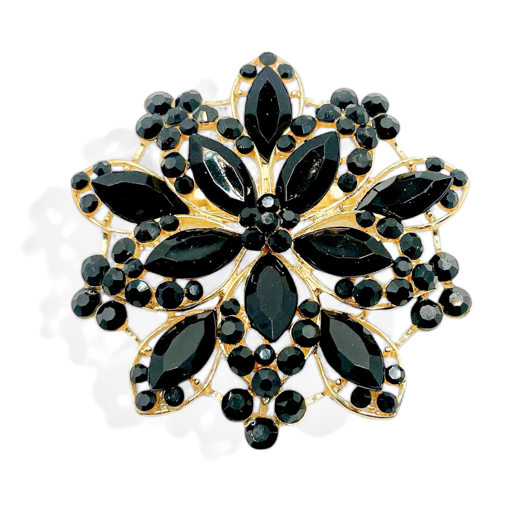 Broche fantaisie forme ronde, sertie de strass doré et pierre ambrée