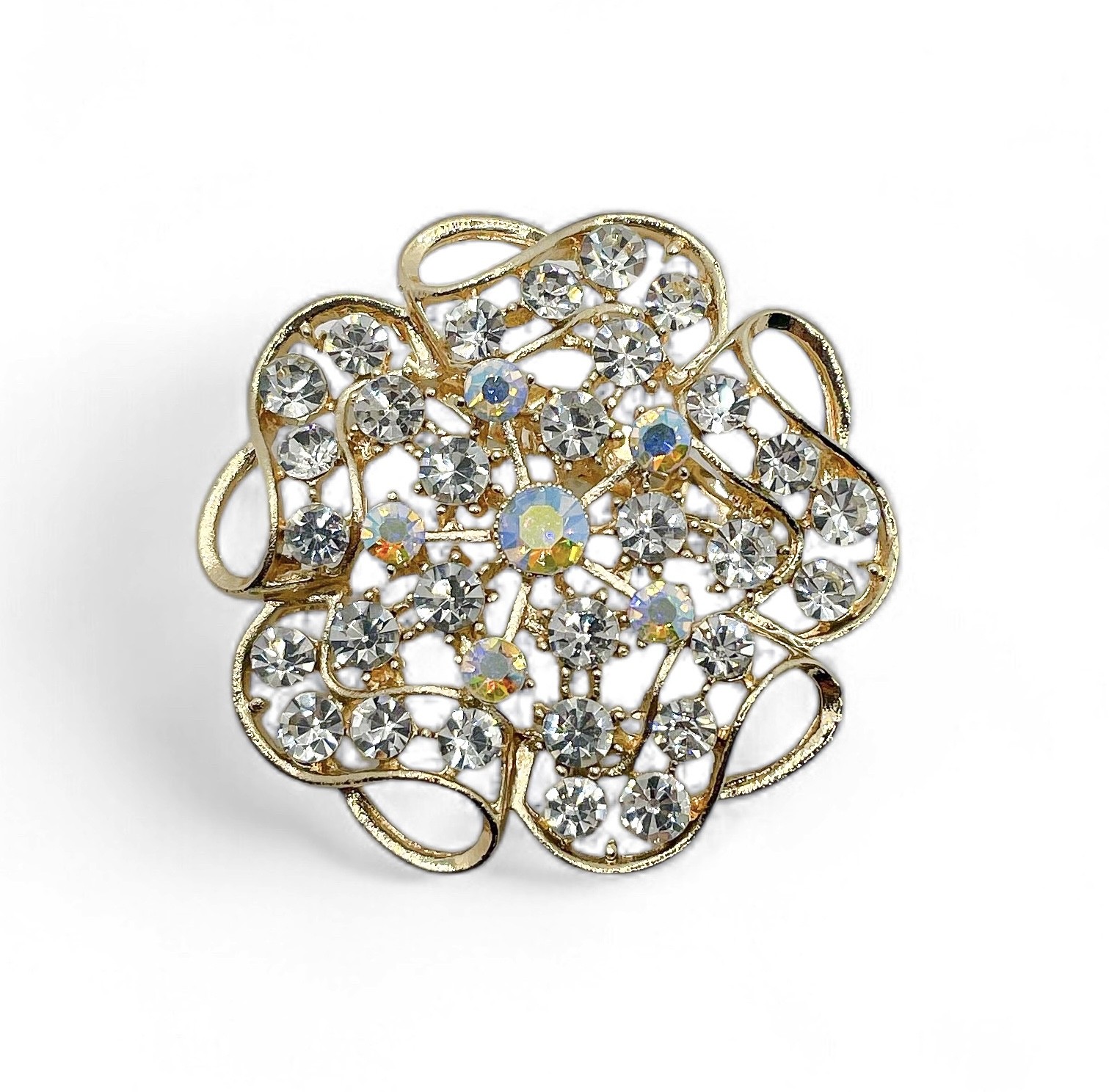 Broche fantaisie forme ronde, sertie de strass doré et pierre blanches