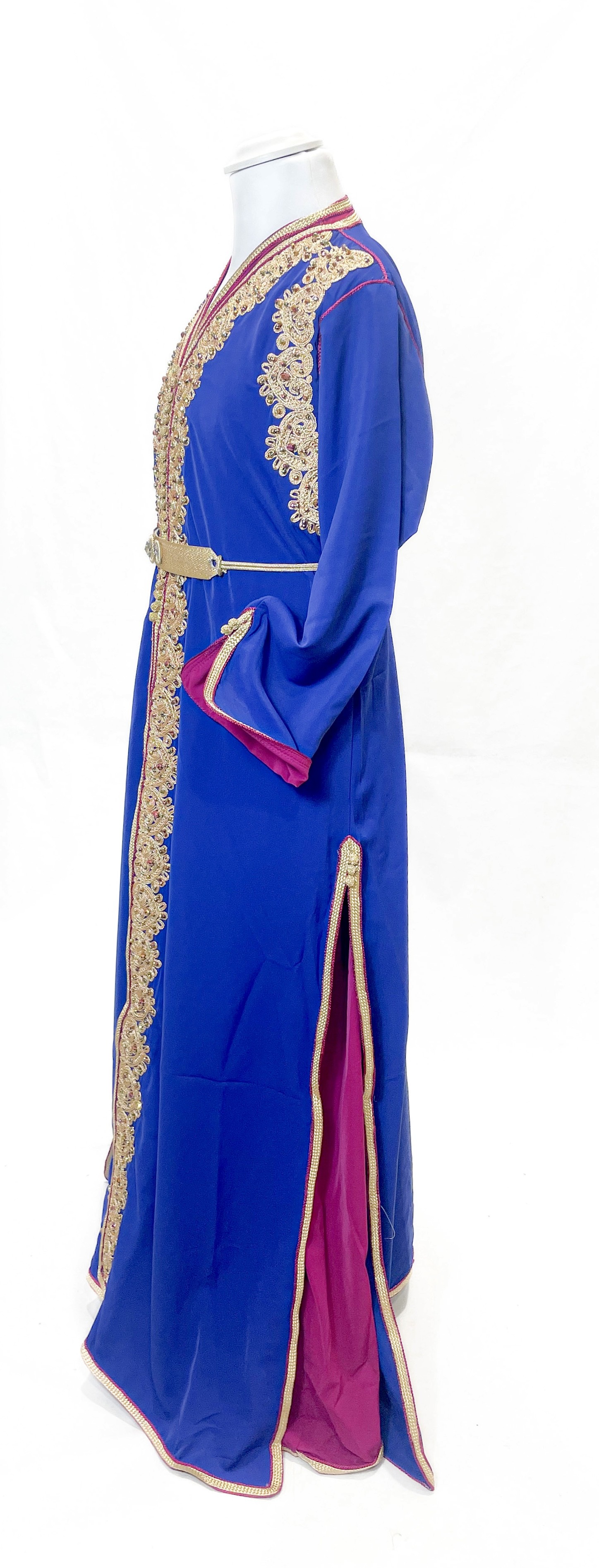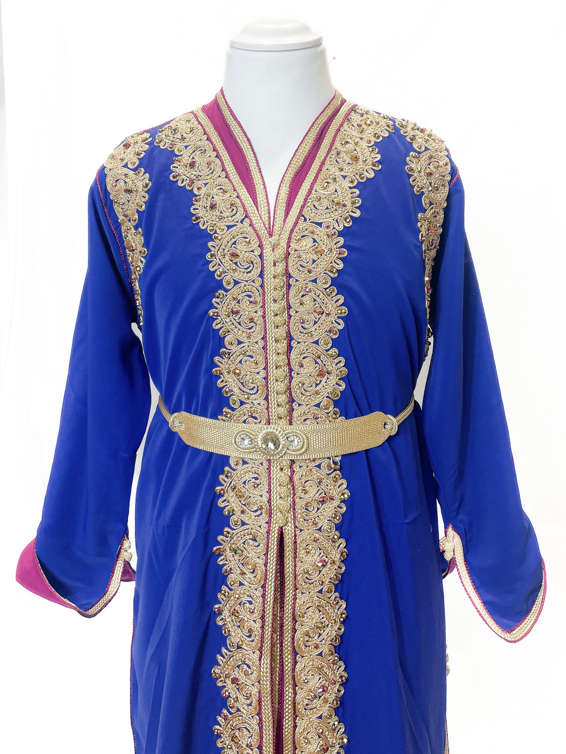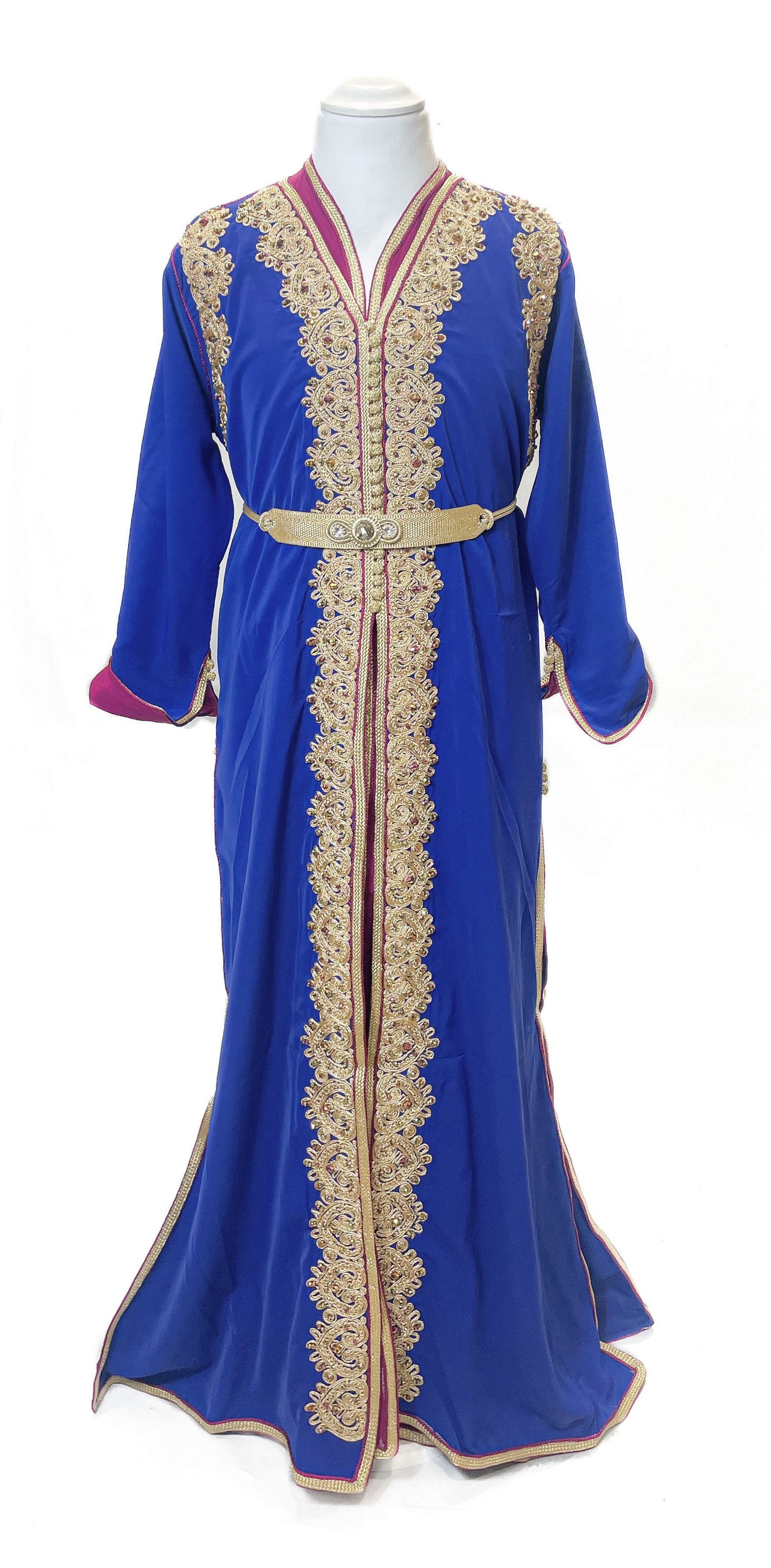 Composée de deux pièces superposées et d’une ceinture assortie incluse, cette takchita met en valeur la silhouette tout en conservant une coupe pudique, élégante et fluide. Les broderies dorées délicates, travaillées avec soin, apportent une touche luxe idéale pour les cérémonies.