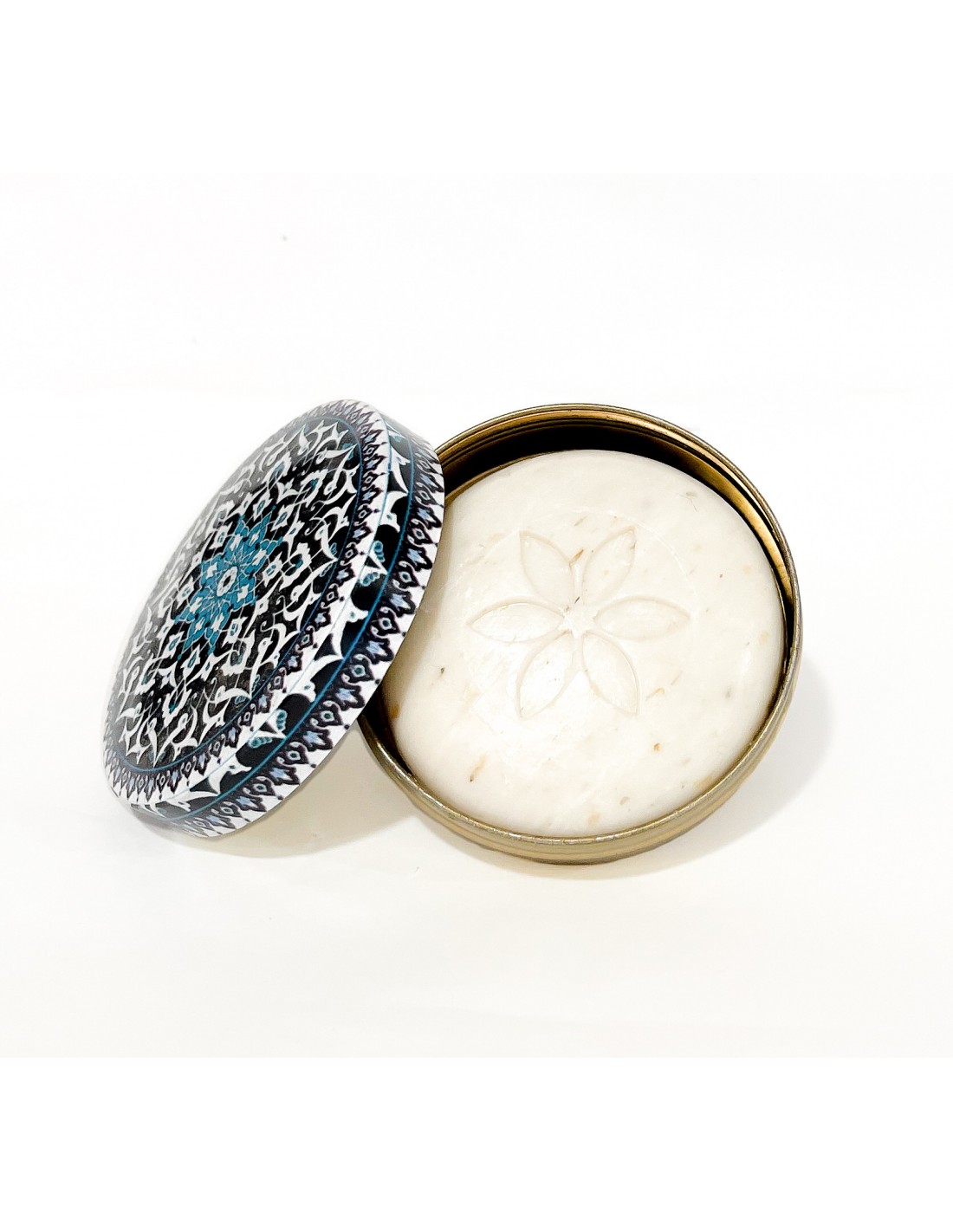 boite en métal motifs indien bleu avec savon parfumé blanc