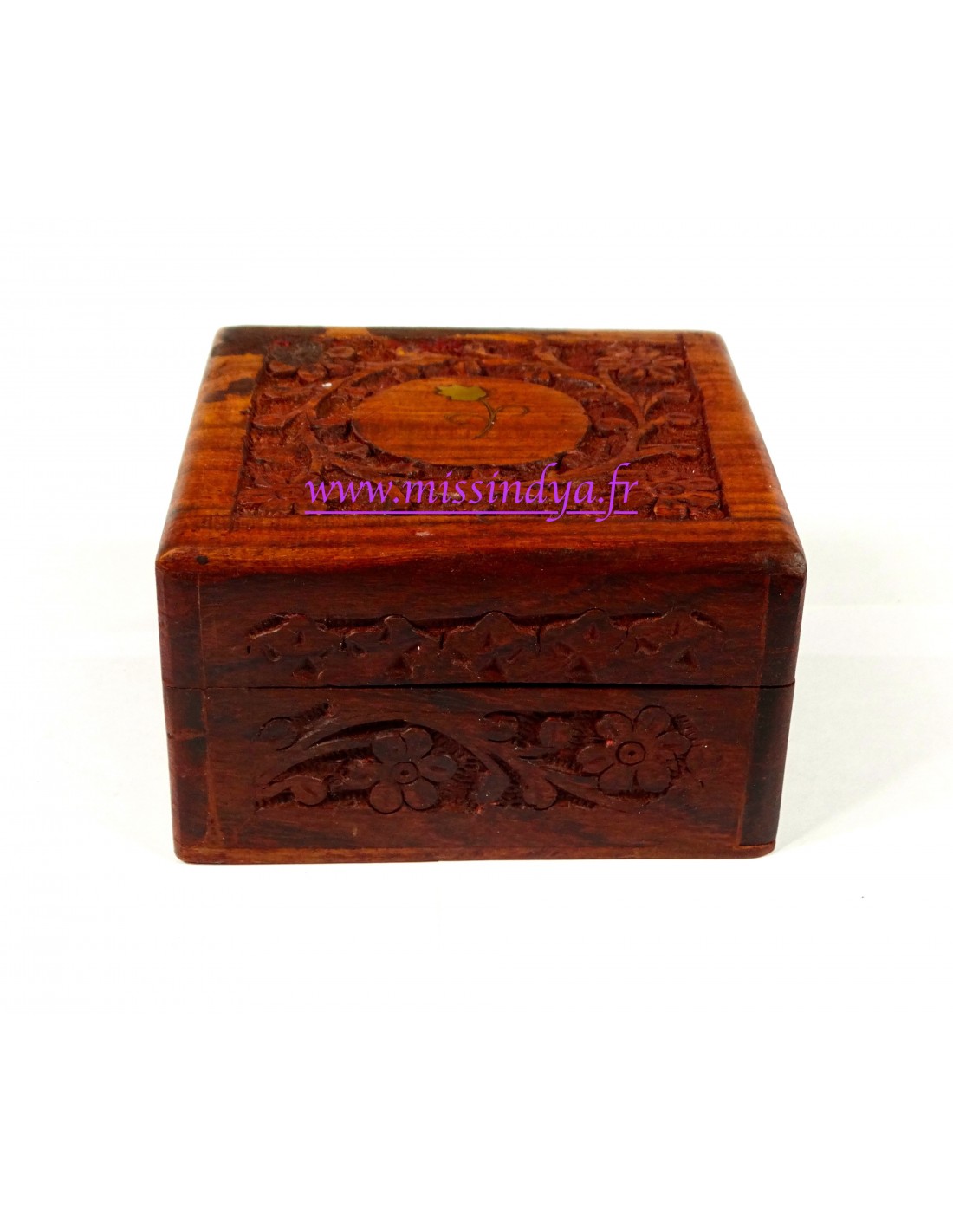 Petite boîte traditionnelle en bois sculpté avec un joli motif sur elle.