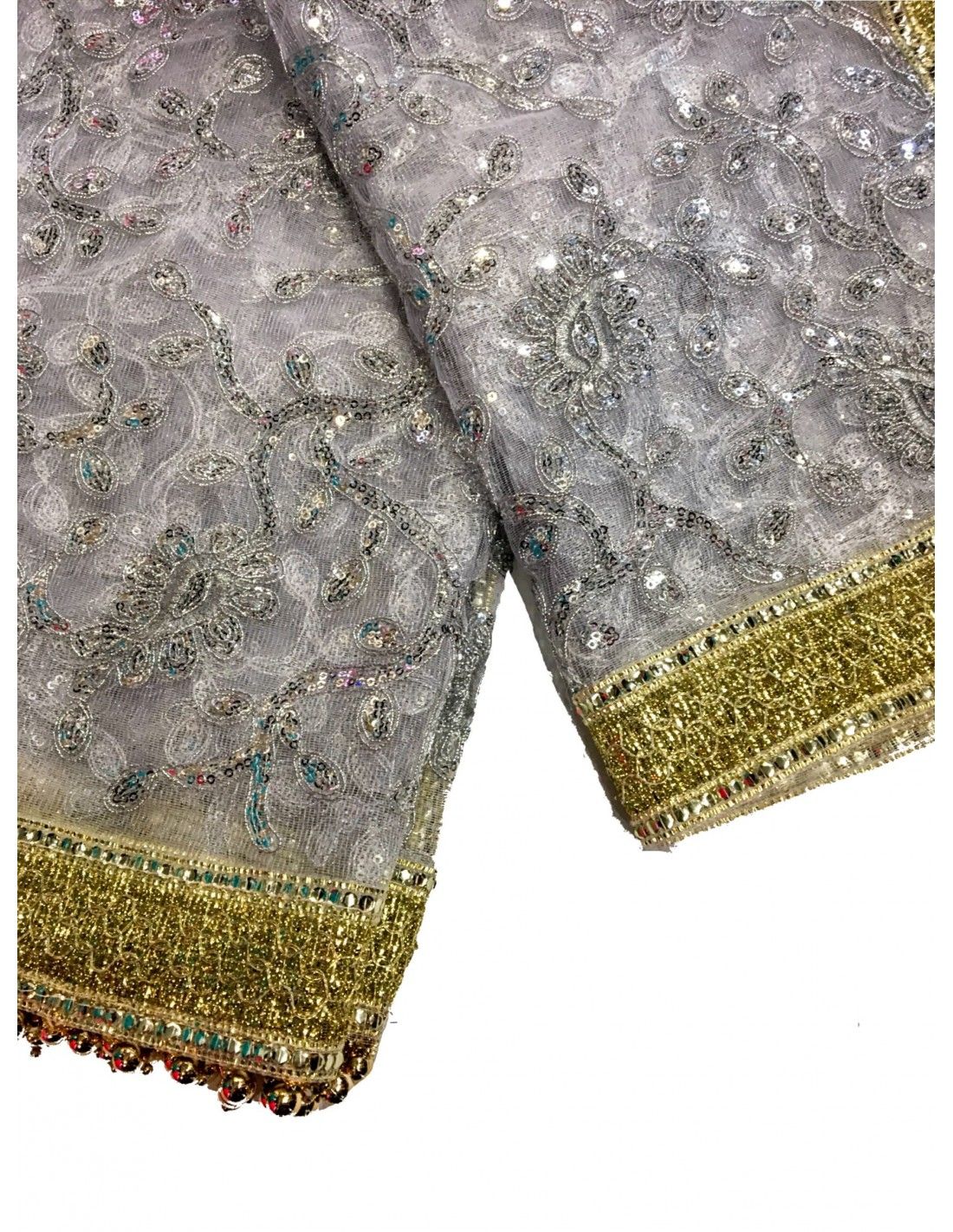Voile indienne en tulle avec des decors en fil doré brodé sur toute la surface du tissus. Peut être utiliser comme voile de marié
