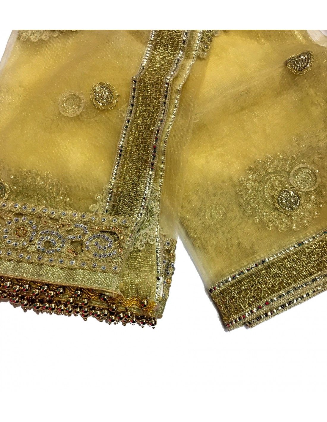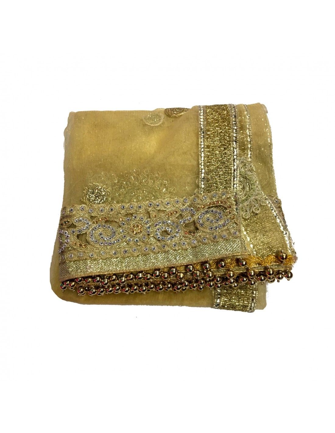 Voile indienne en tulle avec des decors en fil doré brodé sur toute la surface du tissus. Peut être utiliser comme voile de marié