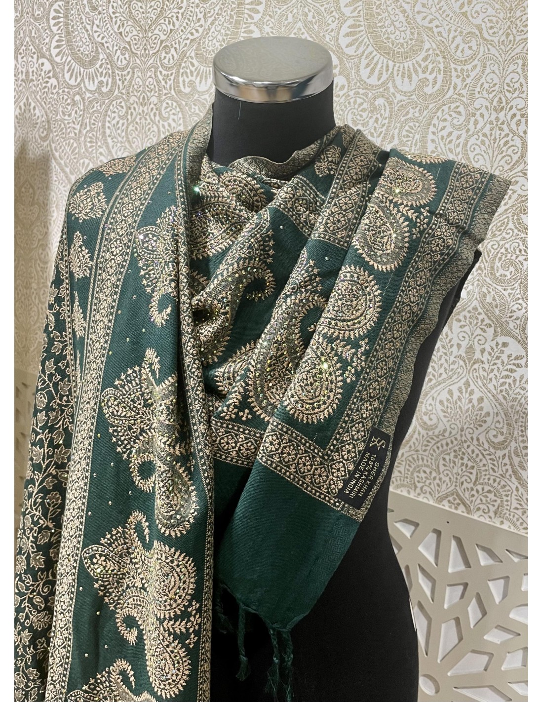 Pashmina Kashmir perle Echarpe haute gamme foulard Vert  - 2