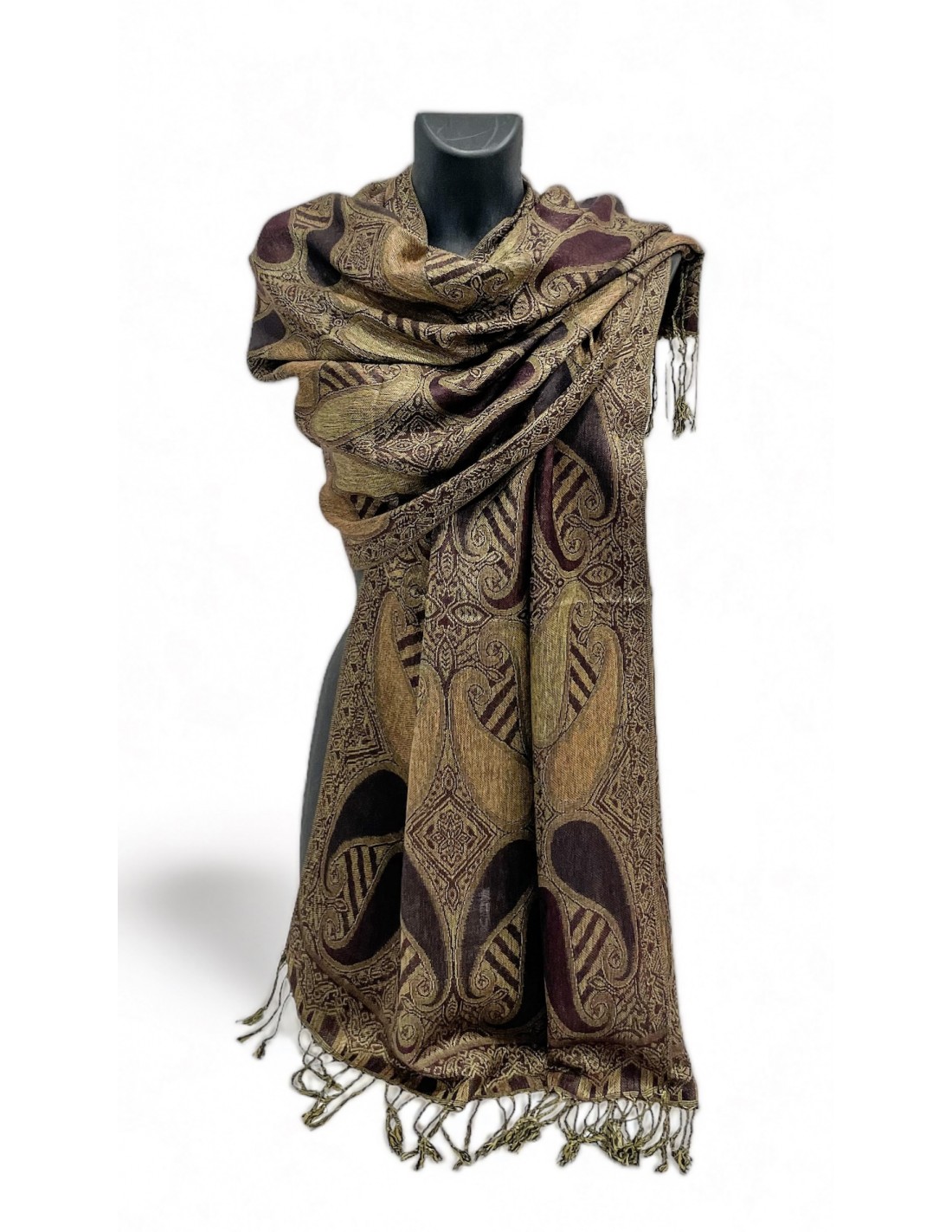 Magnifique pashmina à motifs indiens, finitions franges.