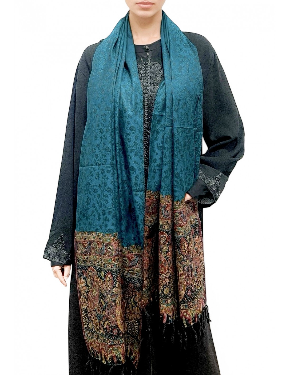 Sublimez votre tenue avec cette étole pashmina vert émeraude ornée de motifs paisley traditionnels et de bordures sophistiquées.