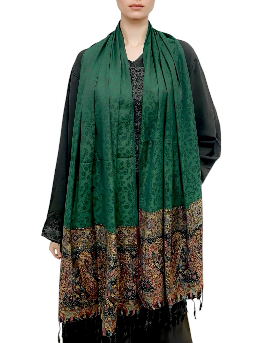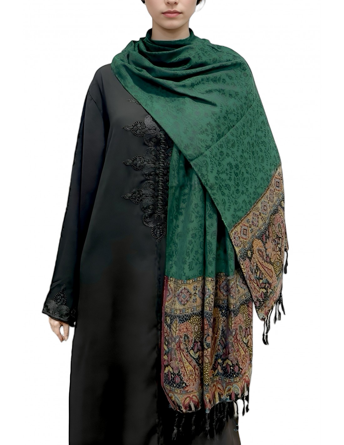 Découvrez cette magnifique écharpe d'un vert émeraude profond, sublimée par des motifs floraux ton sur ton et une bordure richement ornée de motifs traditionnels multicolores. Confectionnée avec un tissu léger et fluide, elle offre un parfait équilibre entre élégance et confort. La bordure finement travaillée intègre des détails complexes rappelant l’artisanat authentique, idéale pour rehausser une tenue formelle ou festive. Cette écharpe est un accessoire intemporel, parfait pour ajouter une touche de sophistication à votre style.