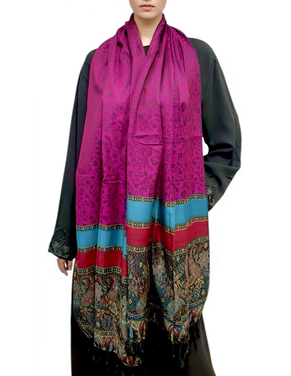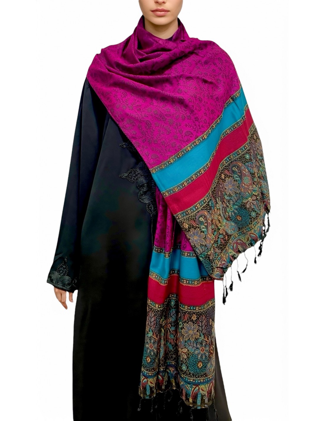 Cette écharpe en pashmina se distingue par son tissu doux et luxueux orné de motifs délicats. Elle présente un mélange harmonieux de couleurs vibrantes : un fond fuchsia texturé de motifs floraux, rehaussé de bandes turquoise et bordeaux aux détails raffinées. Les franges à l'extrémité ajoutent une touche classique et élégante. Parfaite pour rehausser une tenue sobre ou apporter une touche de raffinement.