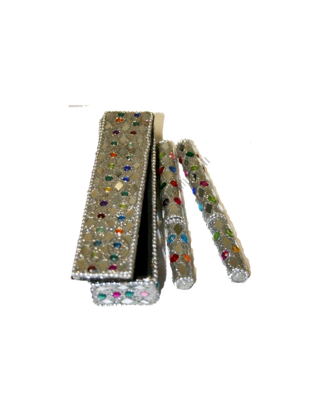 Boîte Pailleté avec couvercle et deux stylos correspondants, les mesures de la Boite 14cms x 4cm et les mesures de stylo 12cms.