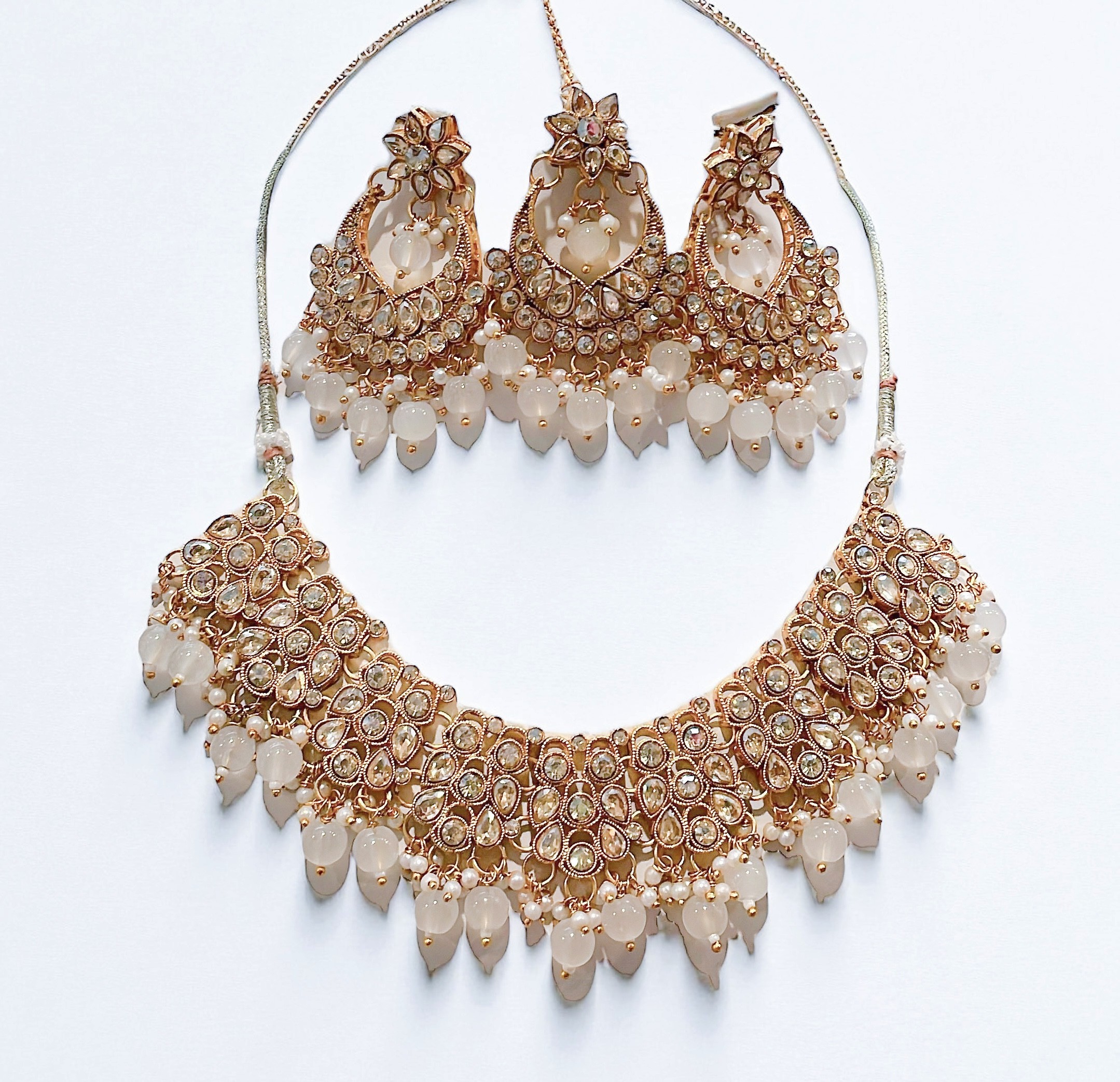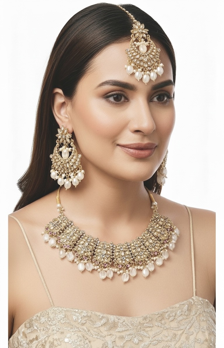 Il n'y a plus d'articles dans votre panier Sublime parure de bijoux dorés agrémentée de perles roses pâles et de motifs floraux étincelants en cristal. L'ensemble comprend un collier ras du cou richement orné, une paire de boucles d'oreilles pendantes assorties et une élégante chaîne de front. Cette parure est idéale pour rehausser une tenue traditionnelle lors de mariages, fêtes et grandes occasions. Un bijou intemporel alliant raffinement et délicatesse.
