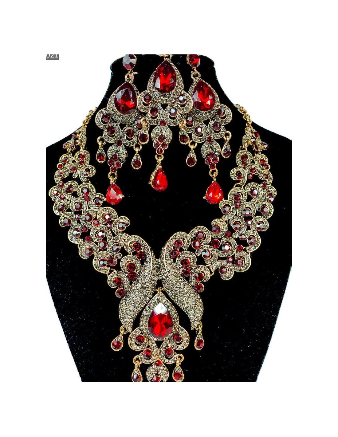 Parure bijoux 4 pièces ornée de strass et rouge et ambre ciselé en forme de paon, travail très raffiné,