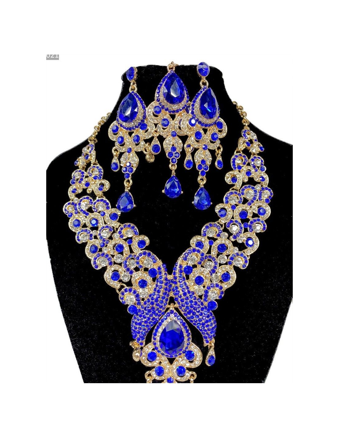 Parure bijoux 4 pièces ornée de strass et bleu royal et doré ciselé en forme de paon, travail très raffiné,