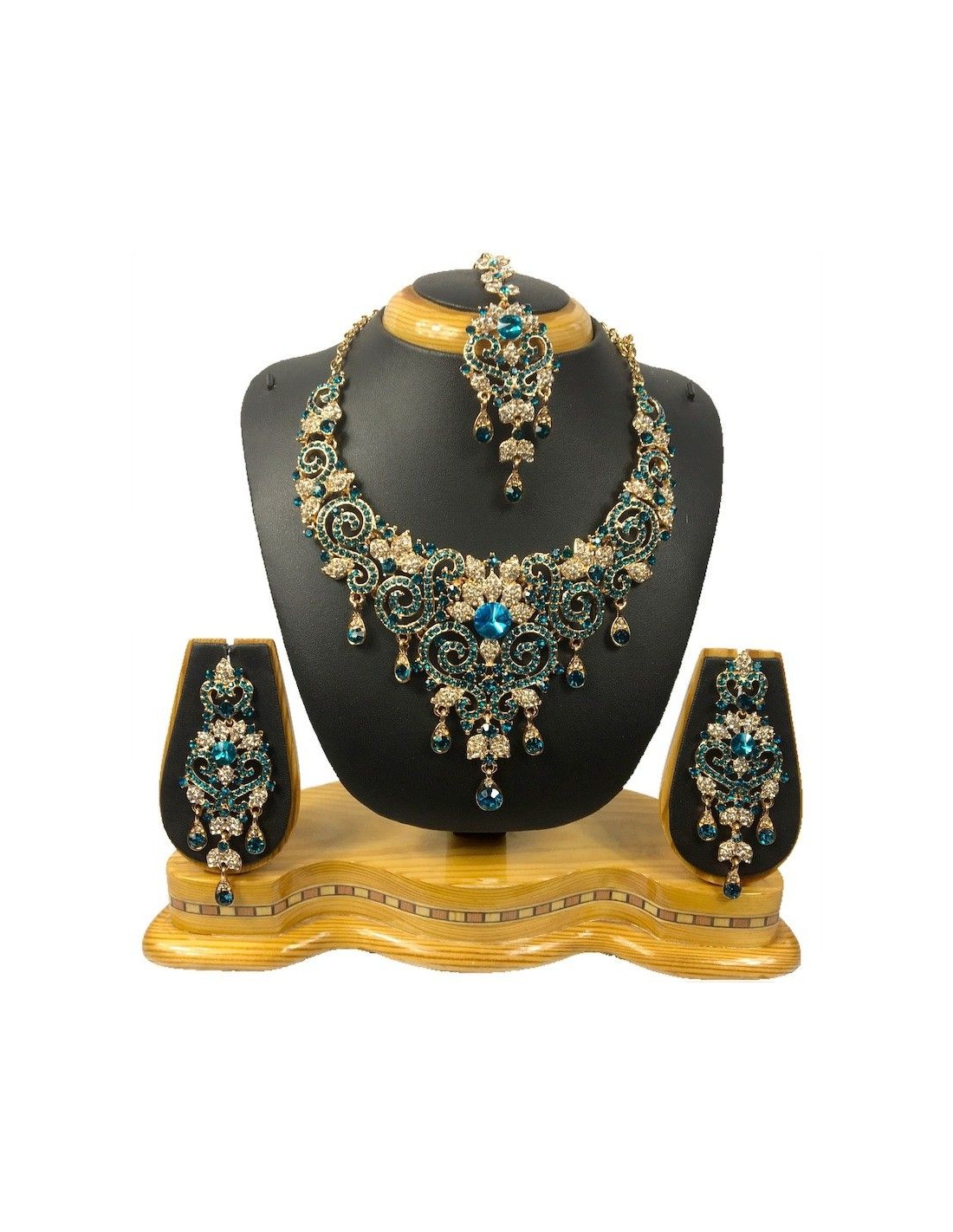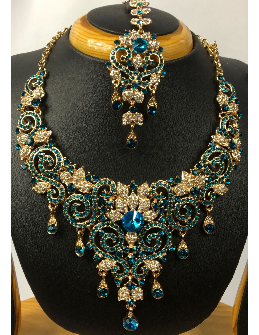 Parure bijoux indiens sertie de strass turquoise et de pierres blanche,