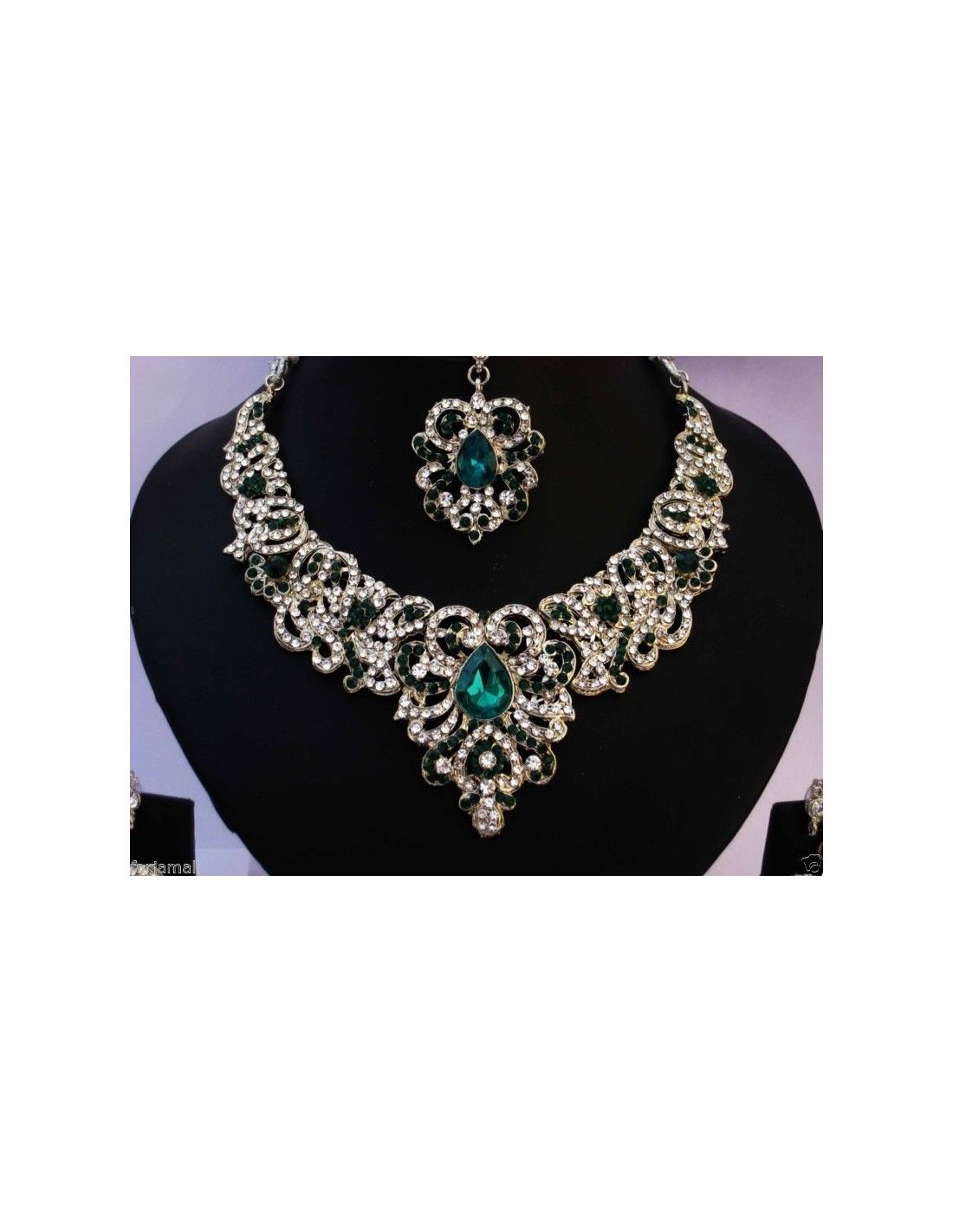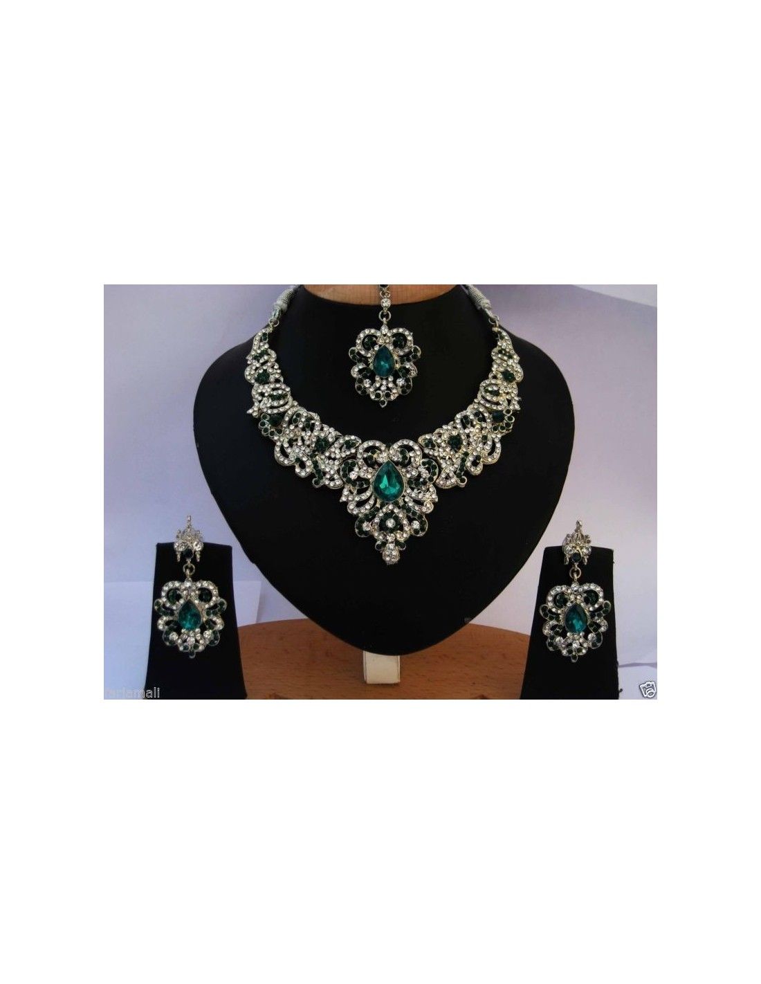 Parure bijoux indienne bollywood Vert et Argenté comprenant :