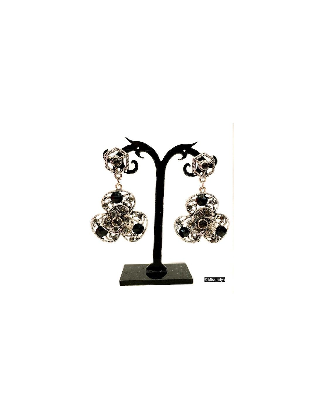 boucles d'oreilles en forme de trèfle, sertie de strass noir et argenté de 3 pierres fantaisie noir
