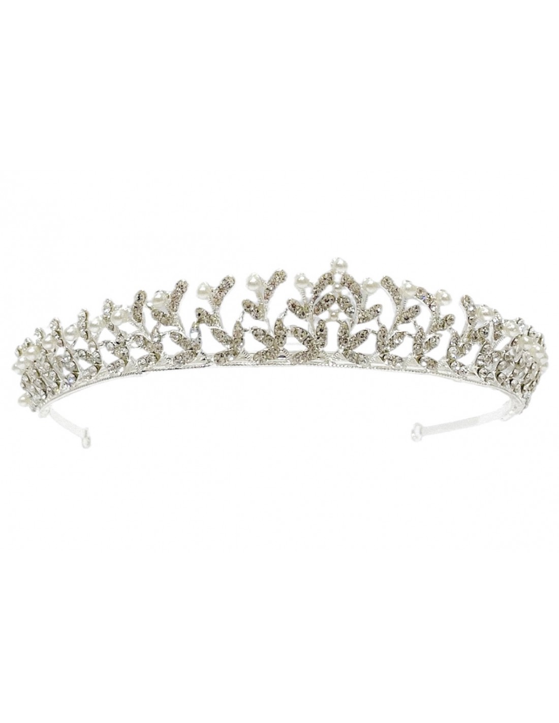 diadème / Couronne de couleur argentée avec strass et petites perles blanches