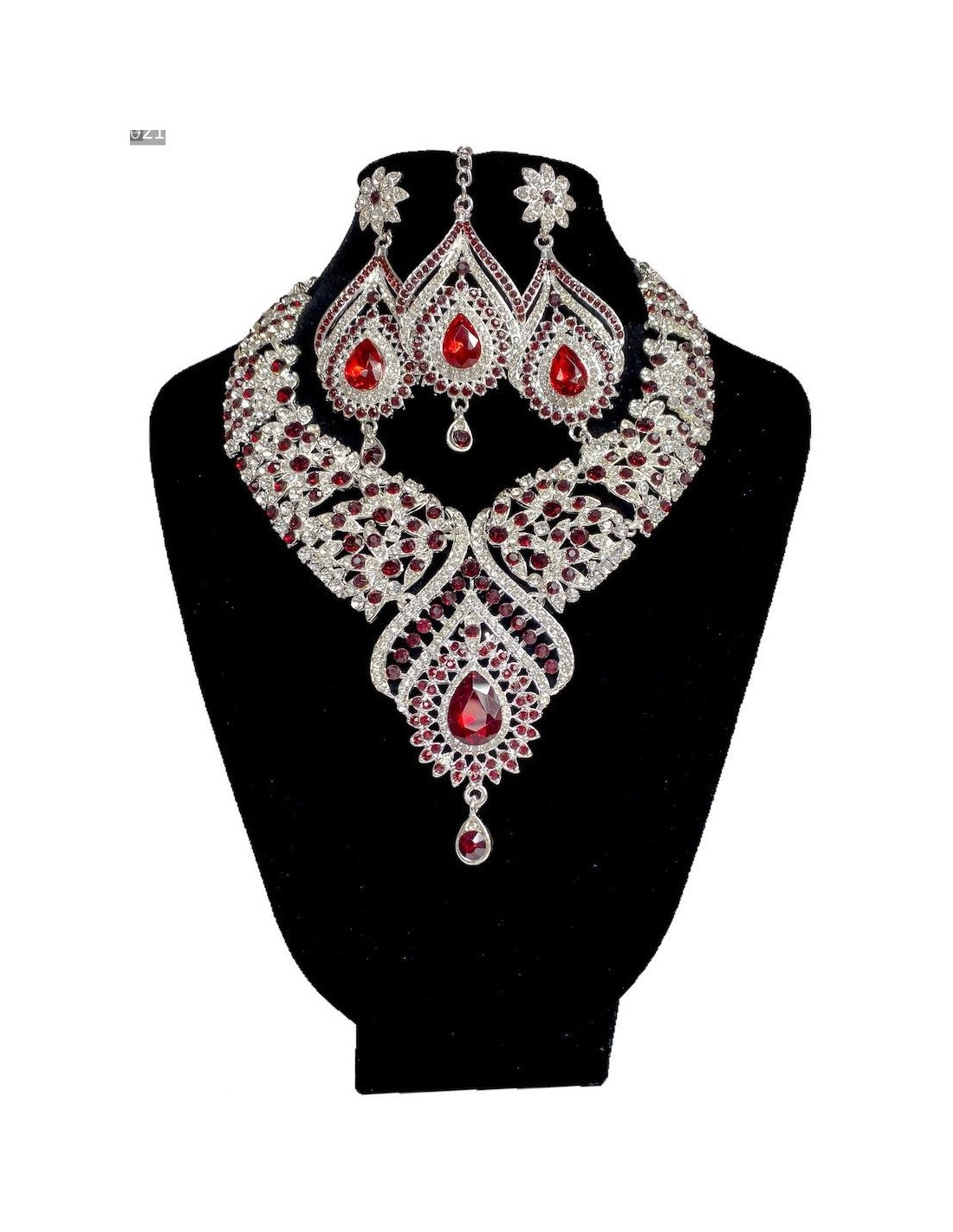 parure bijoux indienne très raffiné de couleurs argenté, serties de pierres et strass rouge