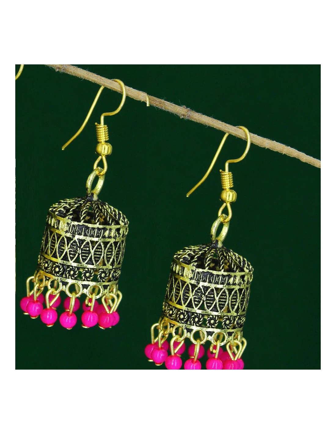 Boucles d’oreilles indienne ornée d’un paon doré et de petites perles rose