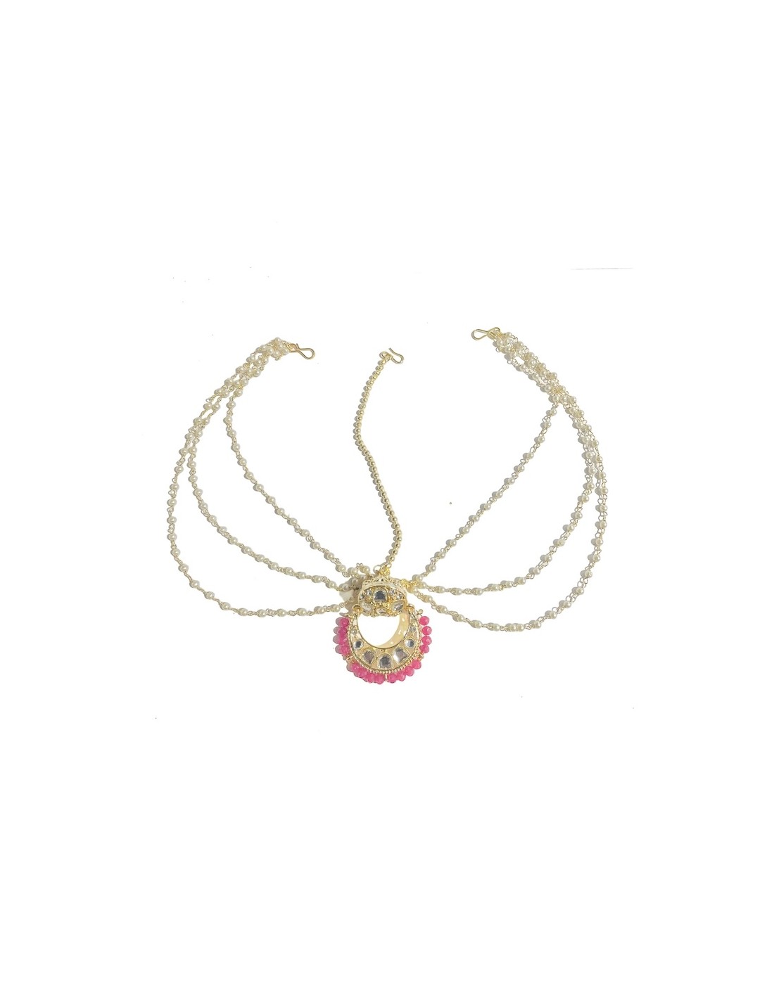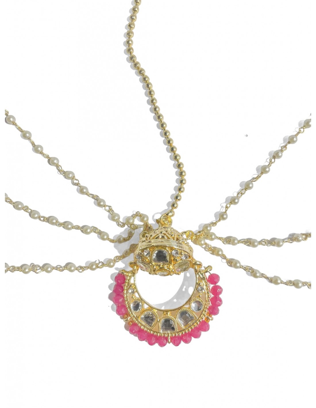 bijoux tête rajasthani borla avec au centre une pierres ronde doré, et perles rose fuchsia