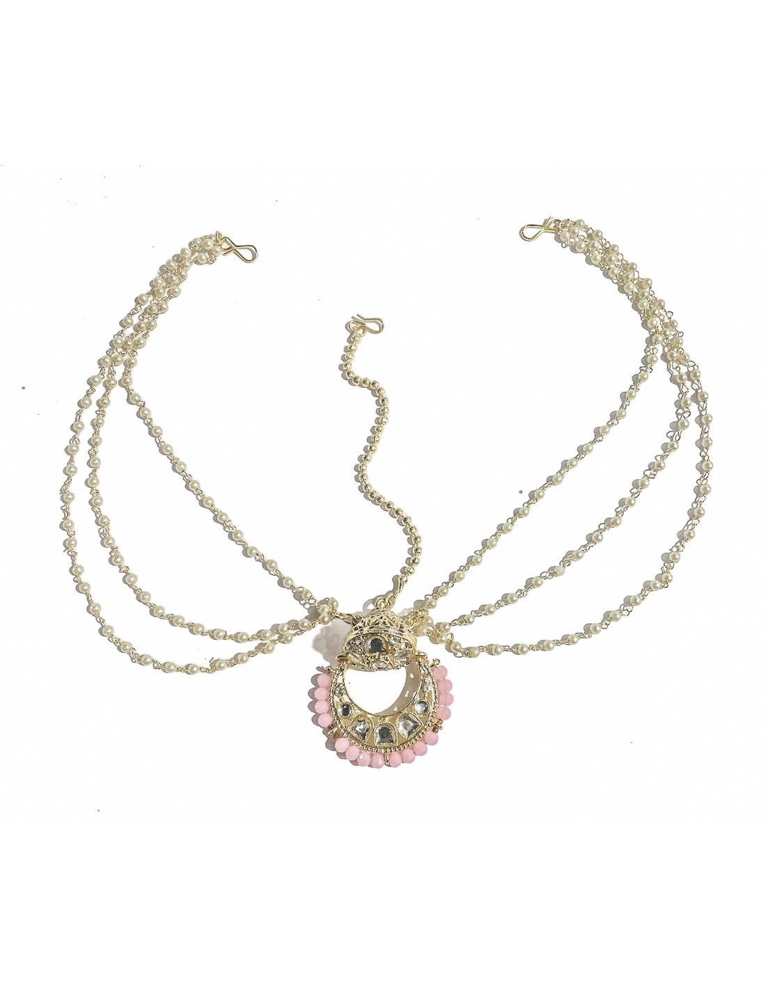 bijoux tête rajasthani borla avec au centre une pierres ronde doré, et perles rose pastel