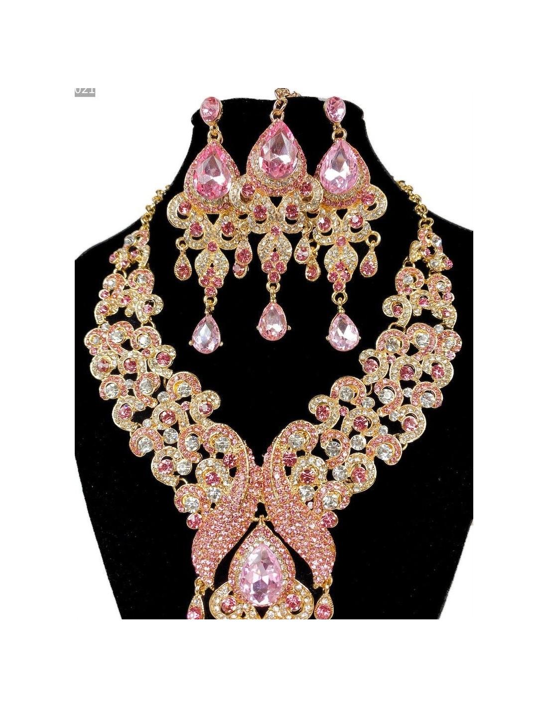 Parure bijoux 4 pièces ornée de strass et pierres rose pâle et blanche ciselé en forme de paon, travail très raffiné,