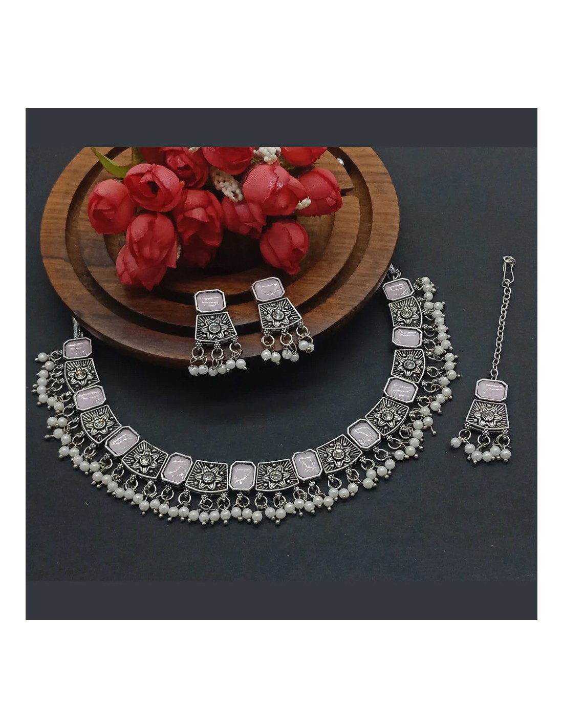 Parure Bijoux collier indienne argenté style oxydé blanc