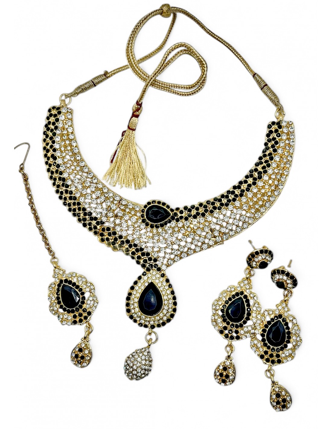 Sublime parure de bijoux dorée, ornée de pierres noires en forme de goutte et de cristaux étincelants. Ce set comprend un collier plastron raffiné ainsi que des boucles d'oreilles pendantes assorties, parfaits pour les grandes occasions, mariages ou soirées élégantes. Le design met en valeur un contraste harmonieux entre l'or brillant et le noir intense, offrant une touche sophistiquée à toute tenue traditionnelle ou moderne.
