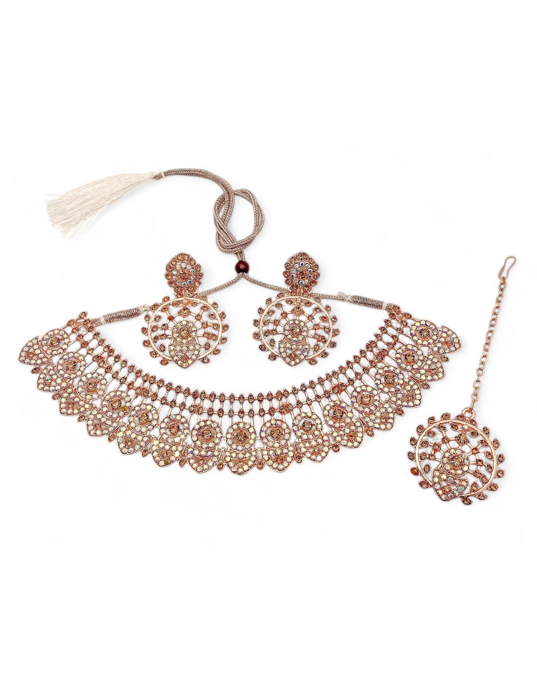Superbe parure de bijoux cuivrée ornée de cristaux scintillants. Ce set raffiné se compose d'un collier plastron au design élégant, de boucles d'oreilles assorties et d'un bracelet finement décoré. Chaque pièce reflète une brillance subtile qui complète à merveille les tenues de soirée et les cérémonies. Idéal pour un mariage ou une occasion spéciale, ce bijou ajoute une touche de glamour et d'élégance intemporelle.