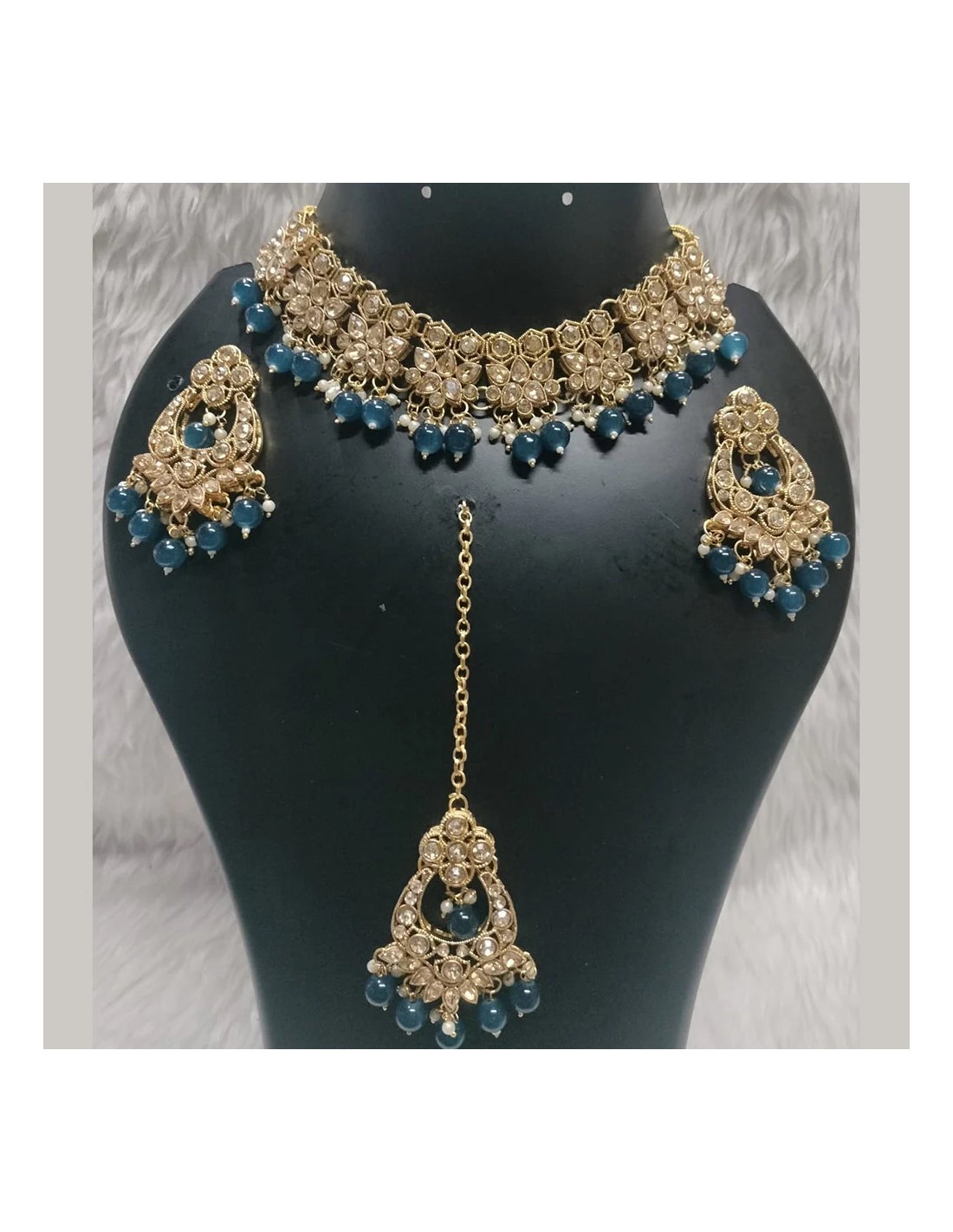 Magnifique parure de bijoux dorés ornée de perles bleues profondes et de détails floraux en cristal. L'ensemble comprend un collier ras du cou richement décoré, une paire de boucles d'oreilles assorties, et une chaîne de front élégante. Cette parure est idéale pour ajouter une touche royale et sophistiquée à vos tenues traditionnelles lors de mariages, fêtes et cérémonies.