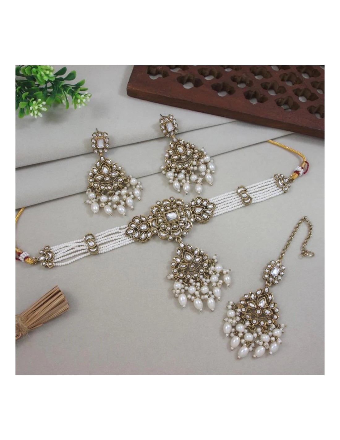 Ensemble de bijoux indiens dorés ornés de perles blanches. Comprend un collier multi-rangs, des boucles d'oreilles pendantes et un maang tikka assorti. Design élégant et raffiné, idéal pour mariages et occasions spéciales.