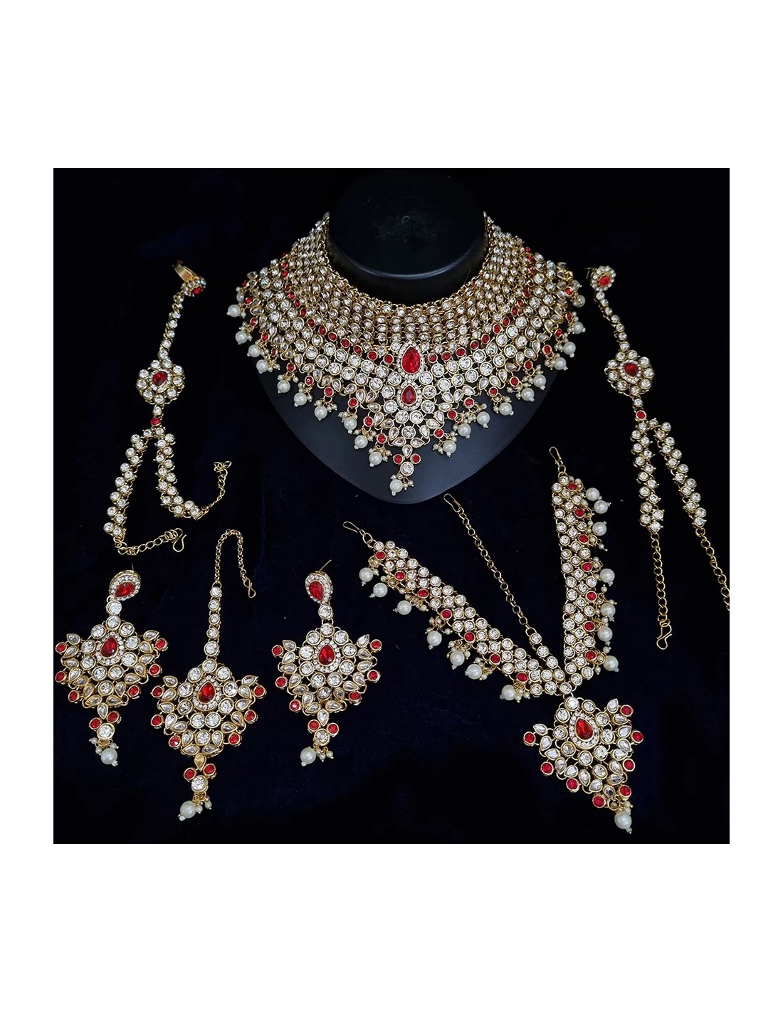 Parure bijoux indienne kundan Jewel rouge doré