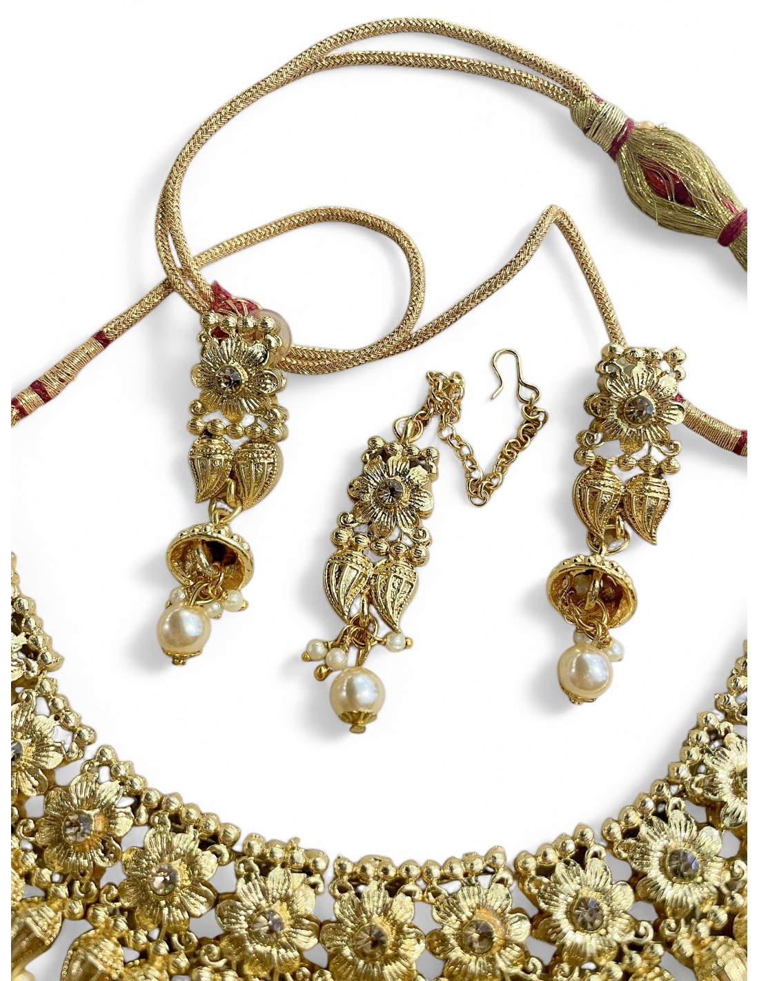 Éblouissante parure de bijoux dorée, incrustée de pierres et de cristaux scintillants. L'ensemble comprend un collier plastron richement orné, des boucles d'oreilles pendantesi. Le design délicat et la combinaison de doré et de bleu font de cette parure un choix parfait pour les grandes occasions comme les mariages, les fêtes ou les soirées de gala.