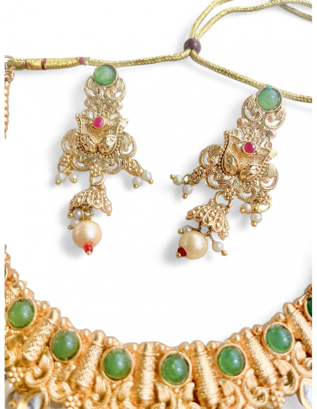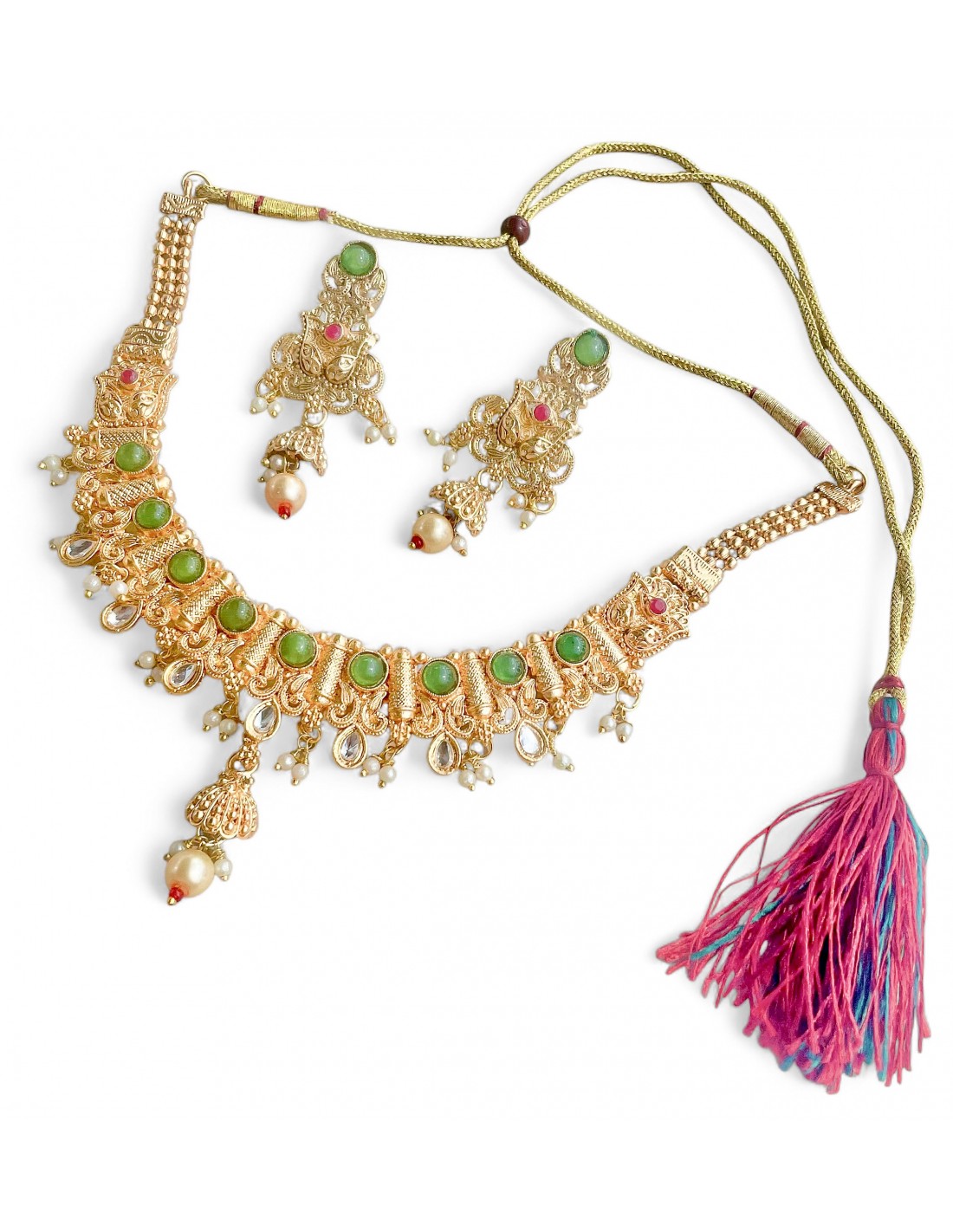 Parure de Bijoux Traditionnels Dorés avec Pierres Vertes et Perles – Collier et Boucles d’Oreilles Style Maharani