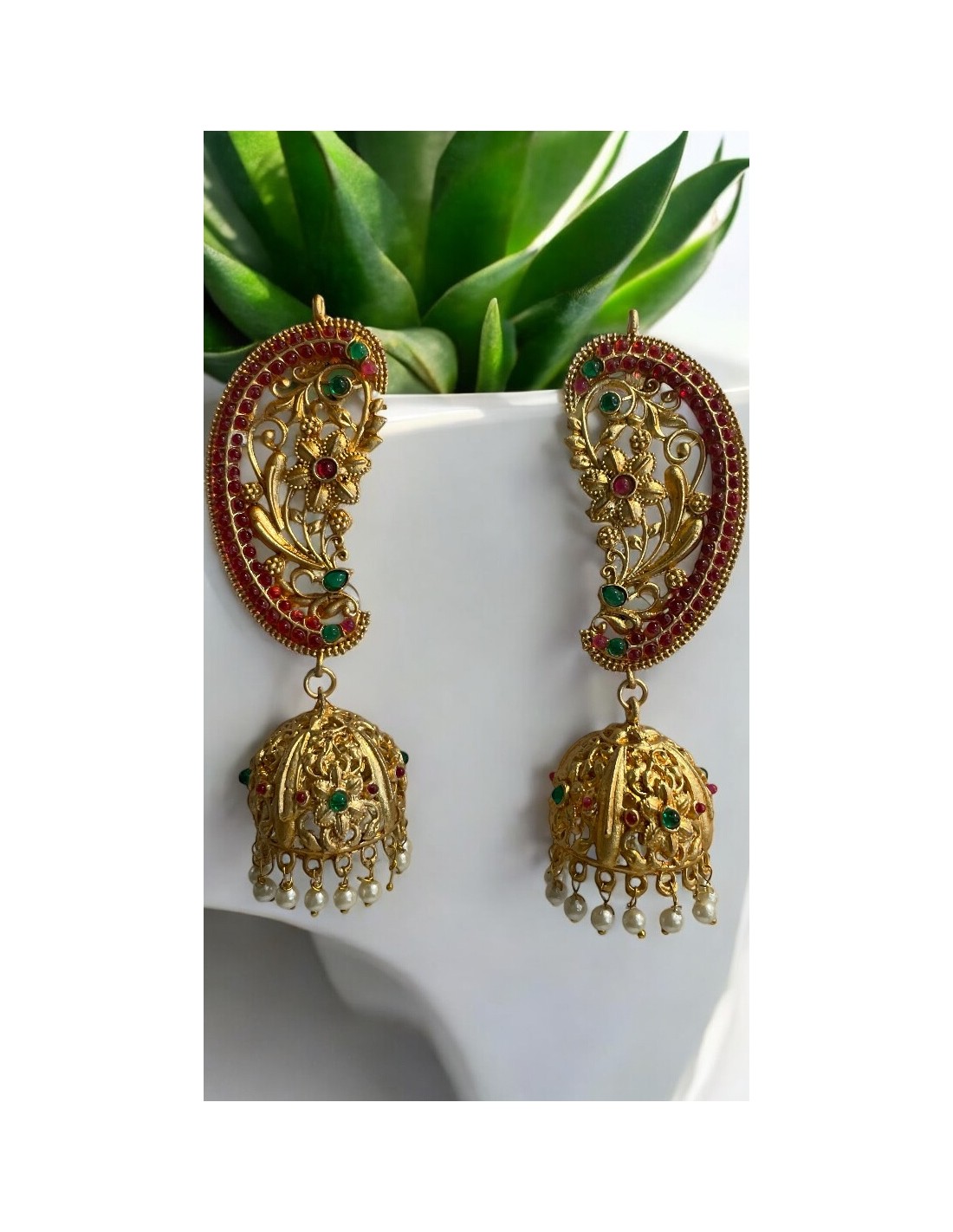 Boucles Indiennes Jhumka Motif Floral avec Pierres Rouge et Vert Émeraude