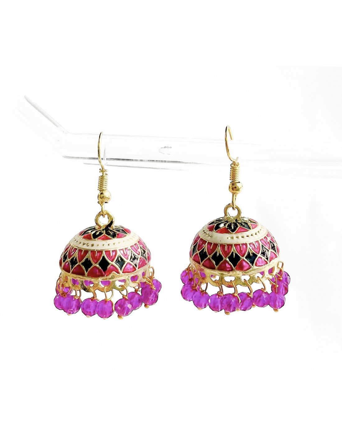 Craquez pour l’élégance intemporelle de ces boucles d’oreilles jhumka artisanales, inspirées de la tradition indienne. Leur forme en cloche, ornée de motifs rouges et noirs émaillés, est sublimée par des perles violettes translucides qui ajoutent une touche de fraîcheur et de féminité. Le tout est monté sur une base dorée pour un rendu chic et raffiné.