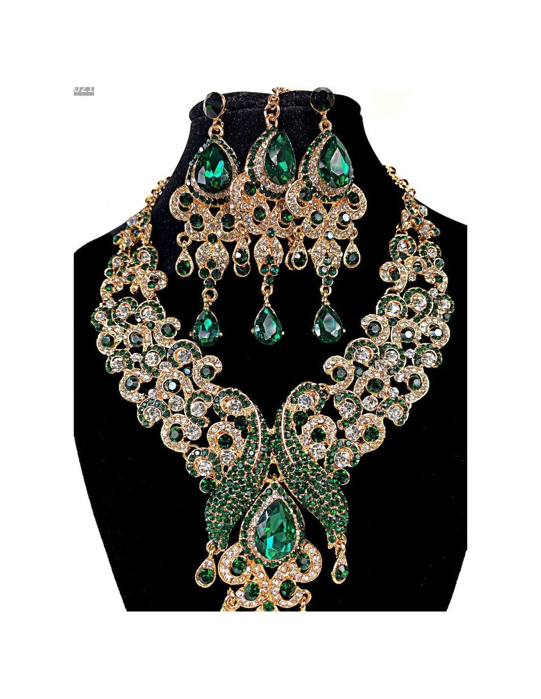 Parure bijoux 4 pièces ornée de strass et vert et doré ciselé en forme de paon, travail très raffiné,