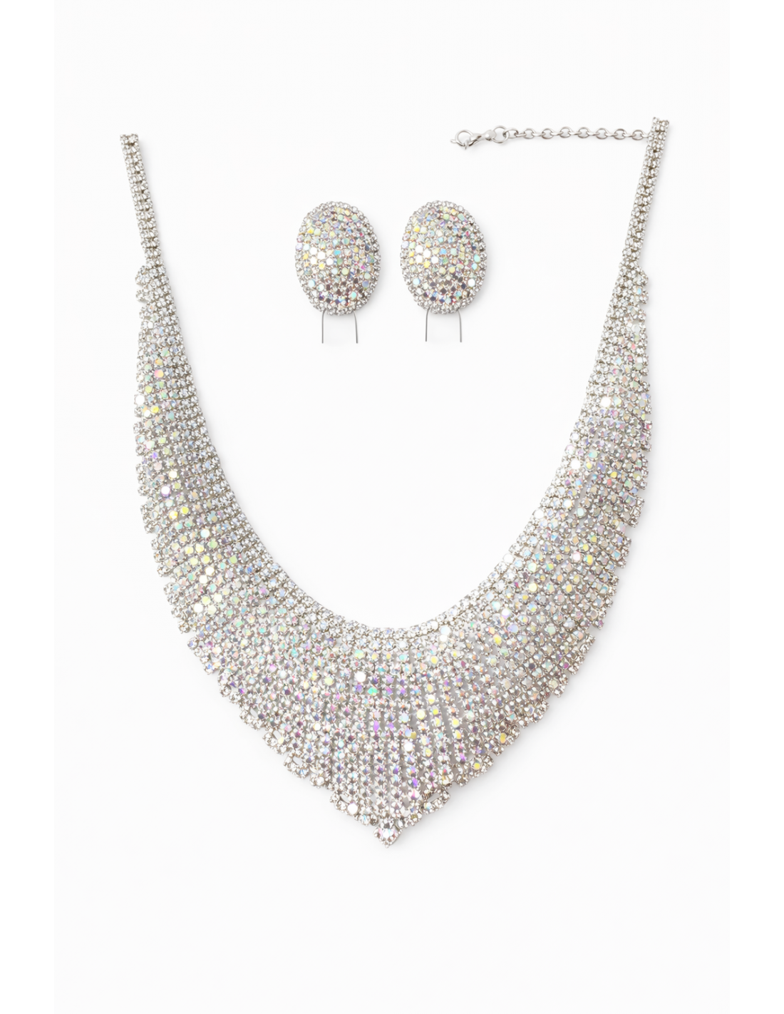 Sublimez votre tenue avec cette magnifique parure de bijoux argentée composée d’un collier en V et de boucles d’oreilles assorties, entièrement ornée de strass scintillants.