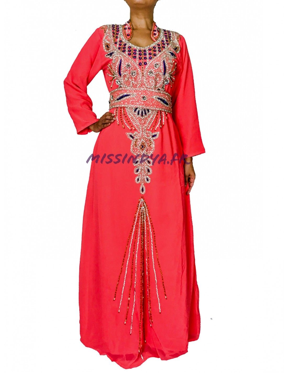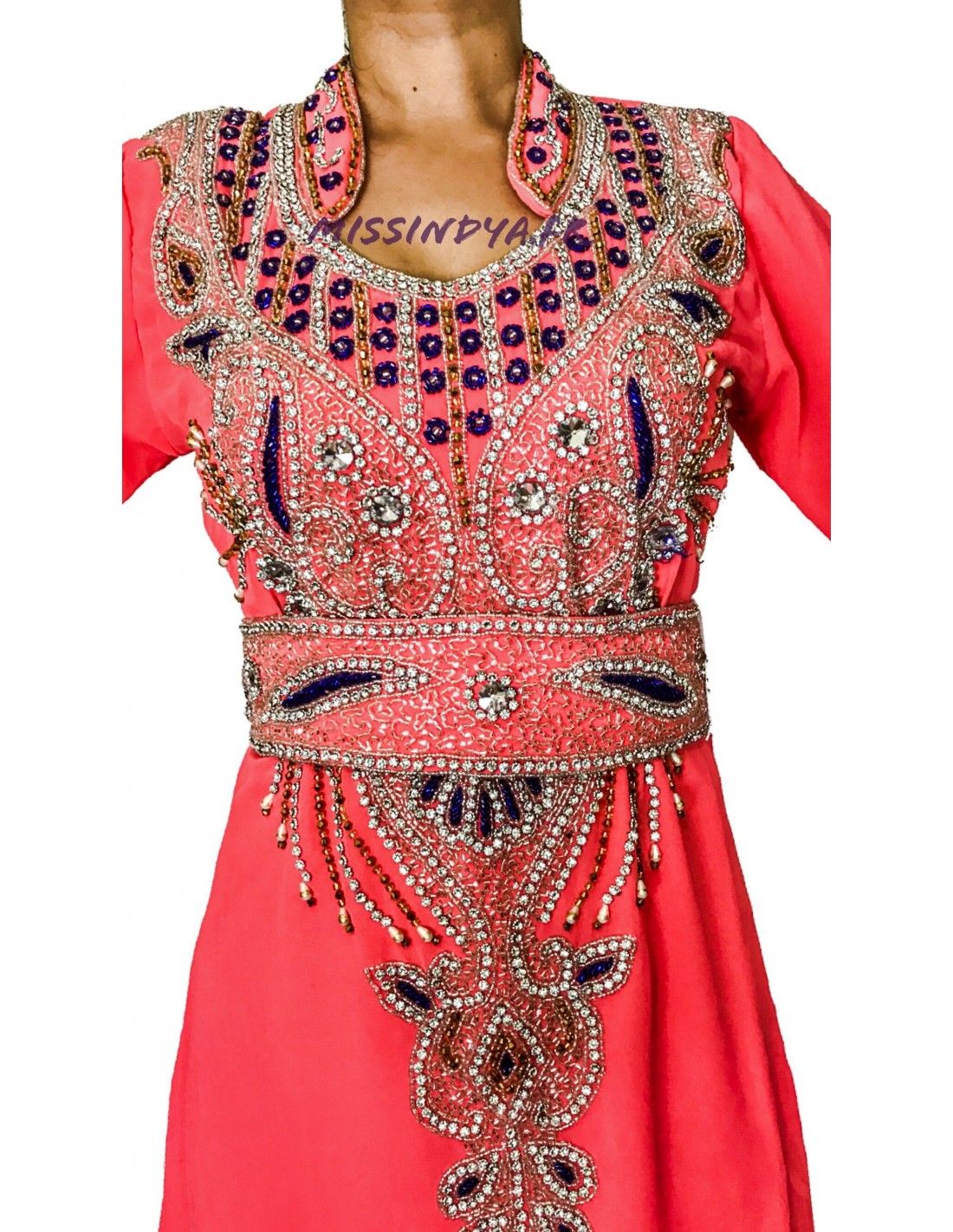 Ensemble 3 pièces Caftan Corail et strass argentés comprenant: