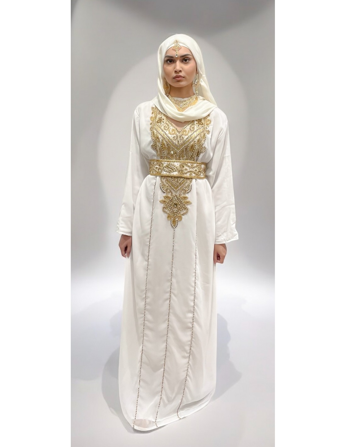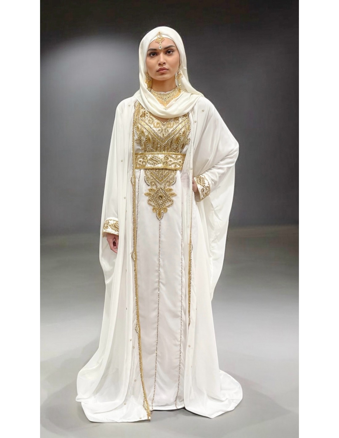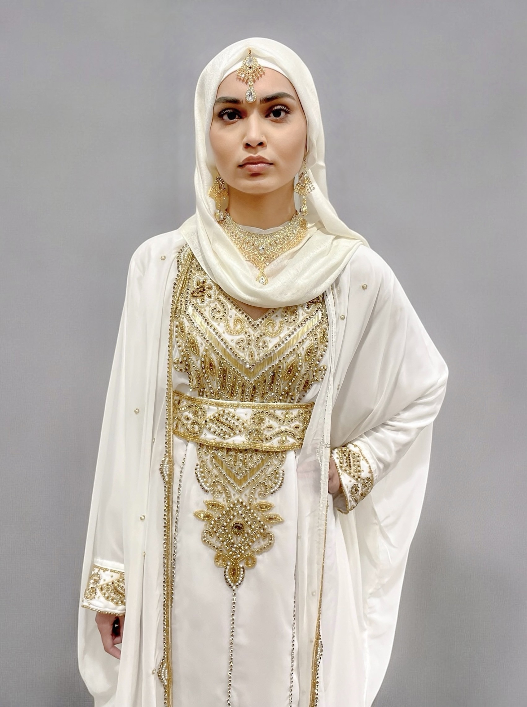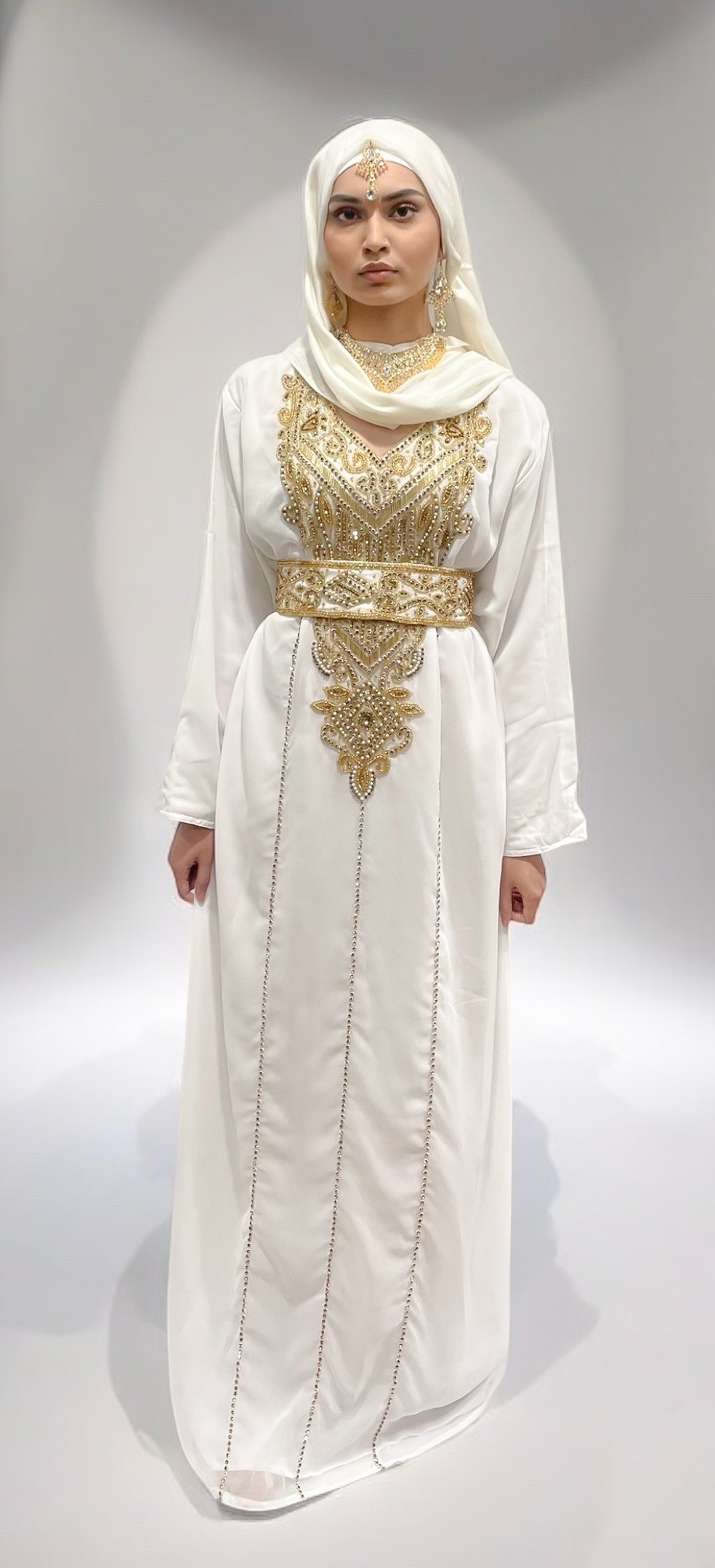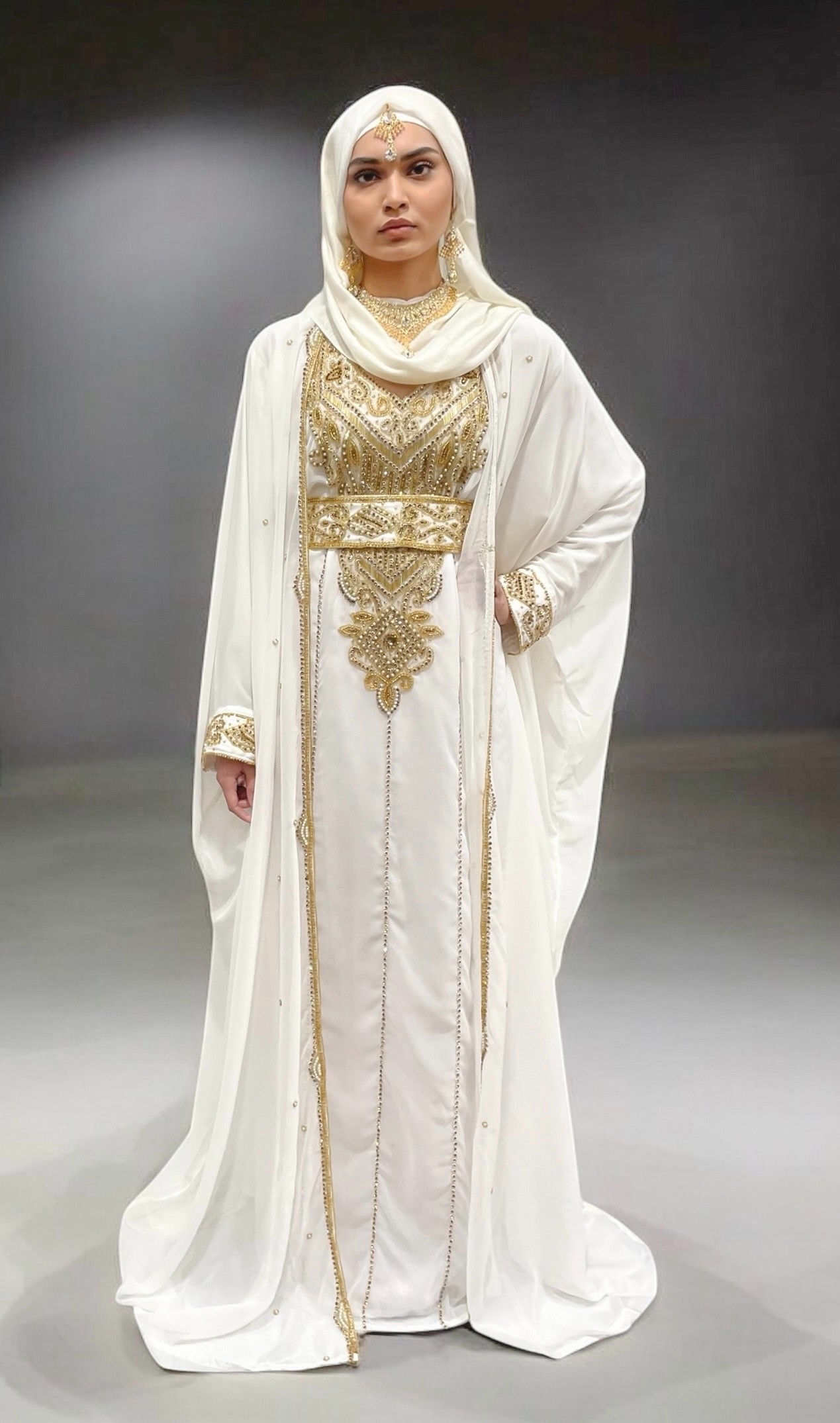 Découvrez ce somptueux caftan blanc style Dubai, sublimé par des broderies, perles et strass dorées et accompagné d'une cape assorti pour une allure mastour et élégante. Parfait pour les mariages, les cérémonies ou la mairie, cette tenue longue et fluide incarne la sophistication orientale tout en respectant vos courbes. Inspirée des robes farasha et des tenues indiennes, cette robe orientale convient également comme alternative moderne au sari. Disponible à petits prix, cette pièce unique allie tradition et modernité avec raffinement.