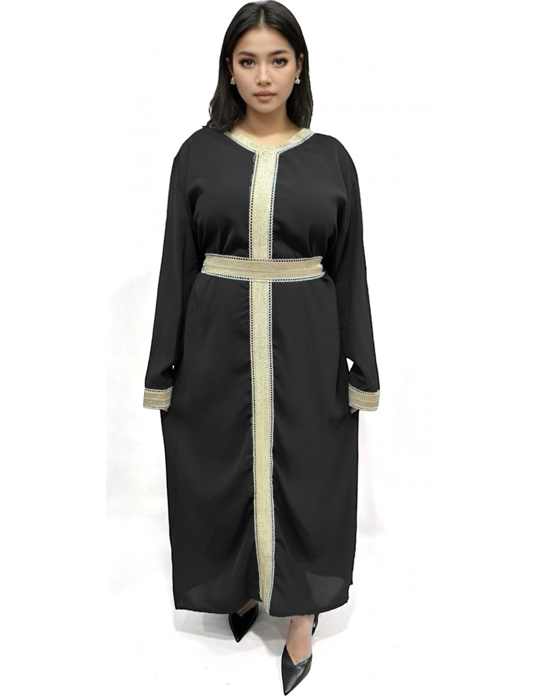 Cette magnifique robe caftan moderne noir incarne le parfait équilibre entre tradition et modernité. Confectionné dans un tissu fluide et léger, il est sublimé par de délicats liserés brodé couleur doré qui ornent le devant, les poignets et la ceinture assortie.