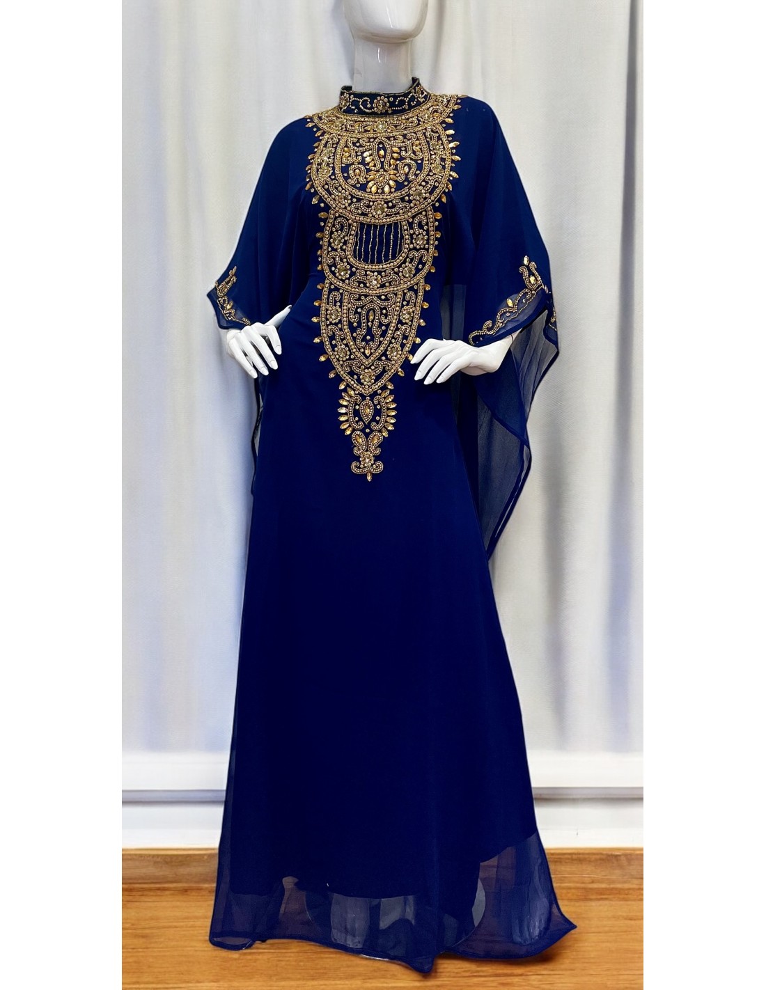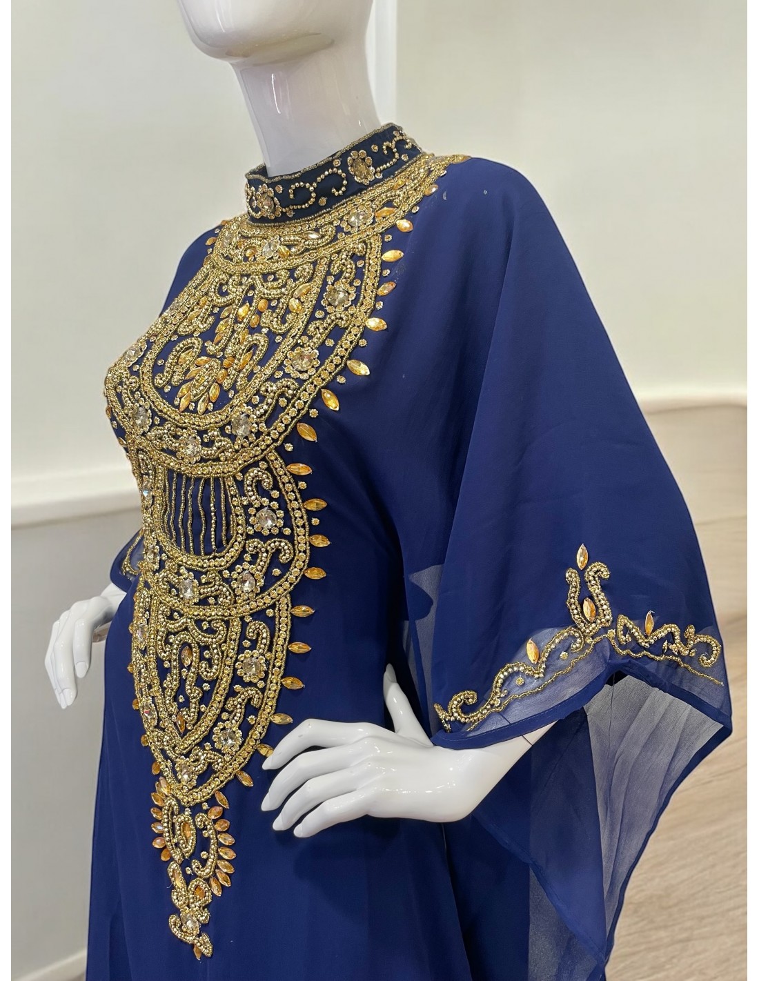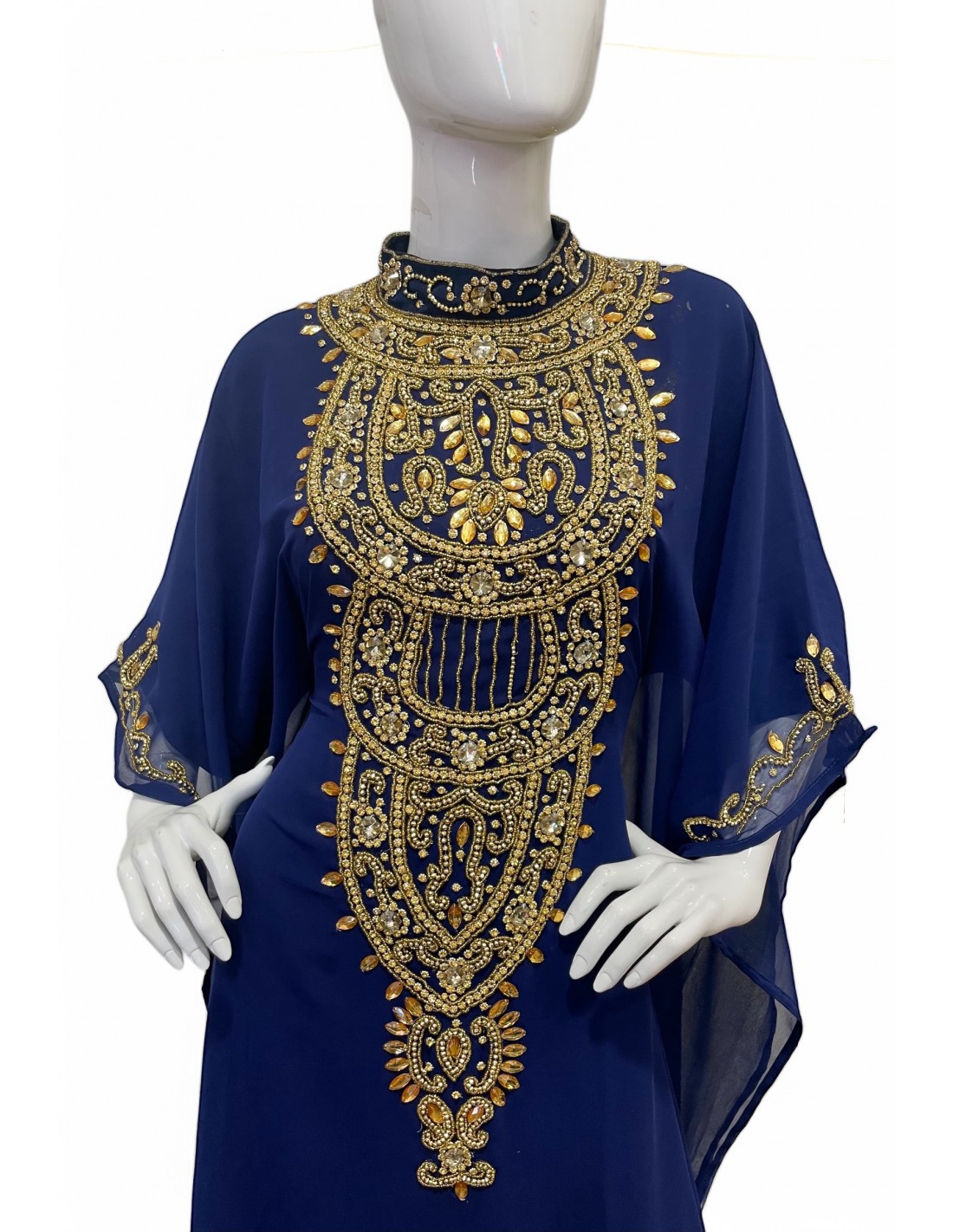 Sublimez votre style avec cette abaya kaftan en bleu nuit, parfaite pour les occasions spéciales et cérémonies. Confectionnée dans un tissu fluide et léger, elle offre un confort incomparable tout en restant élégante. Les strass et perles dorées délicatement travaillées sur le buste apportent une touche de raffinement et d'éclat, faisant de cette pièce un incontournable pour un look chic et intemporel. Cette abaya est dotée de manches papillons amples et d'une coupe fluide, adaptée à toutes les morphologies, pour une allure gracieuse et modeste.
