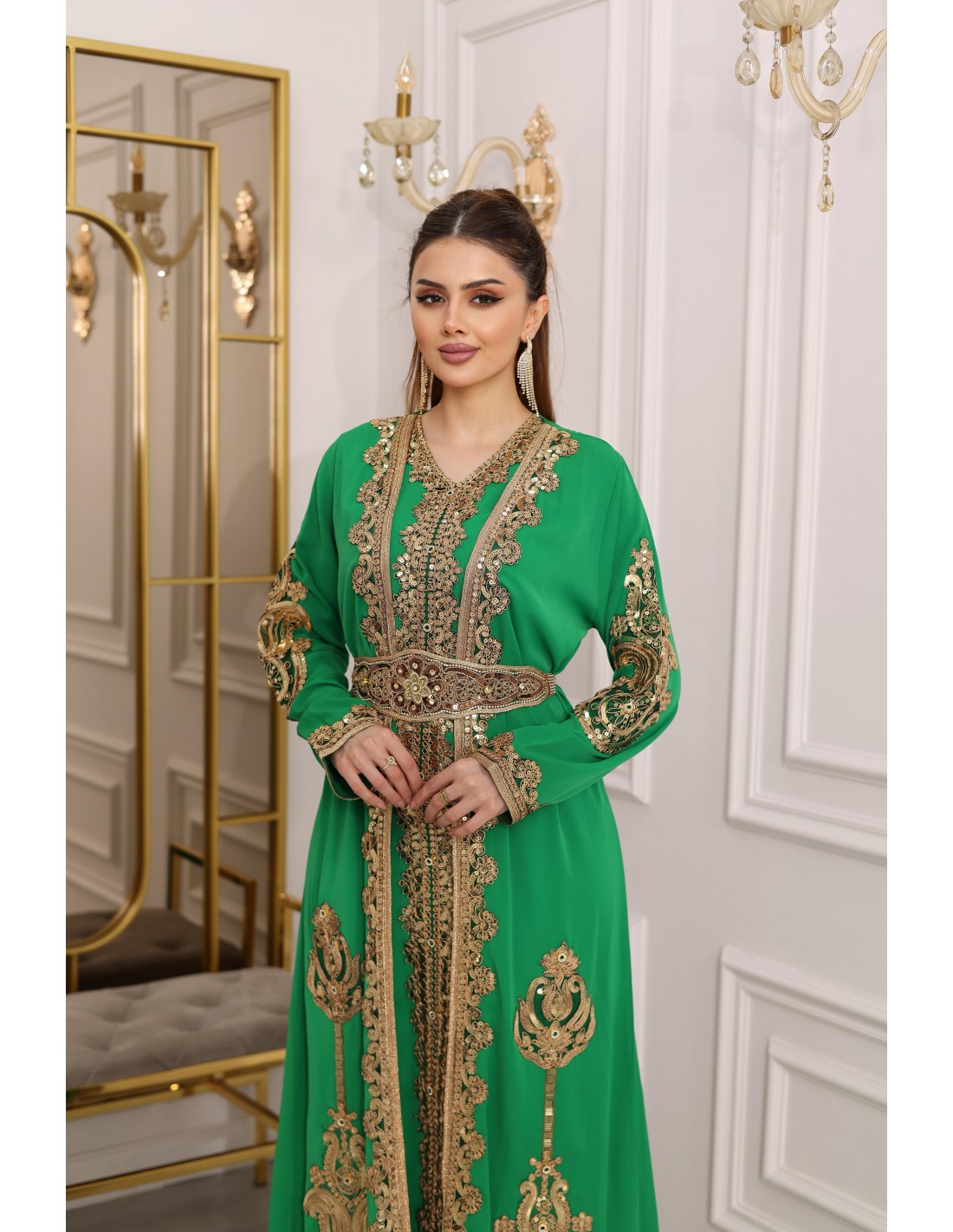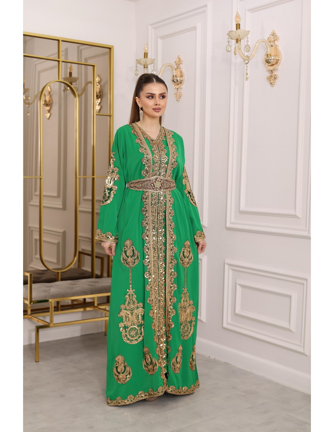 Le haut long (caftan) s'accompagne d'une ceinture brodée qui sublime la silhouette et affine la taille. Les détails dorés minutieusement brodés sur les manches, le devant et l’arrière de la robe en font une pièce d’exception, idéale pour les occasions spéciales : mariage, fiançailles, henné, ou fêtes religieuses.