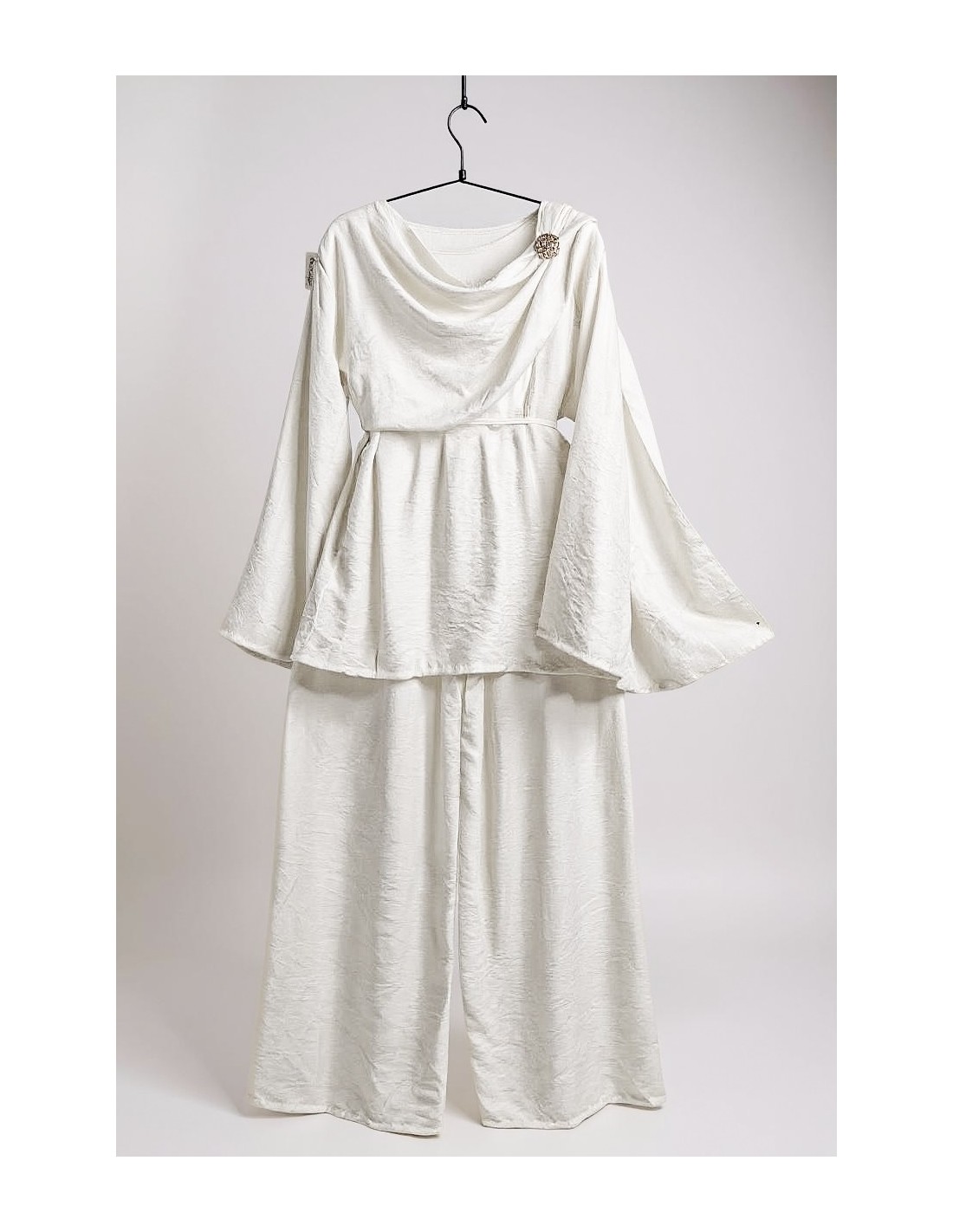 Composé d’un haut drapé style sari, des manches évasées et d’un pantalon large taille haute, cet ensemble en tissu légèrement texturé, offre un tombé fluide et flatteur.