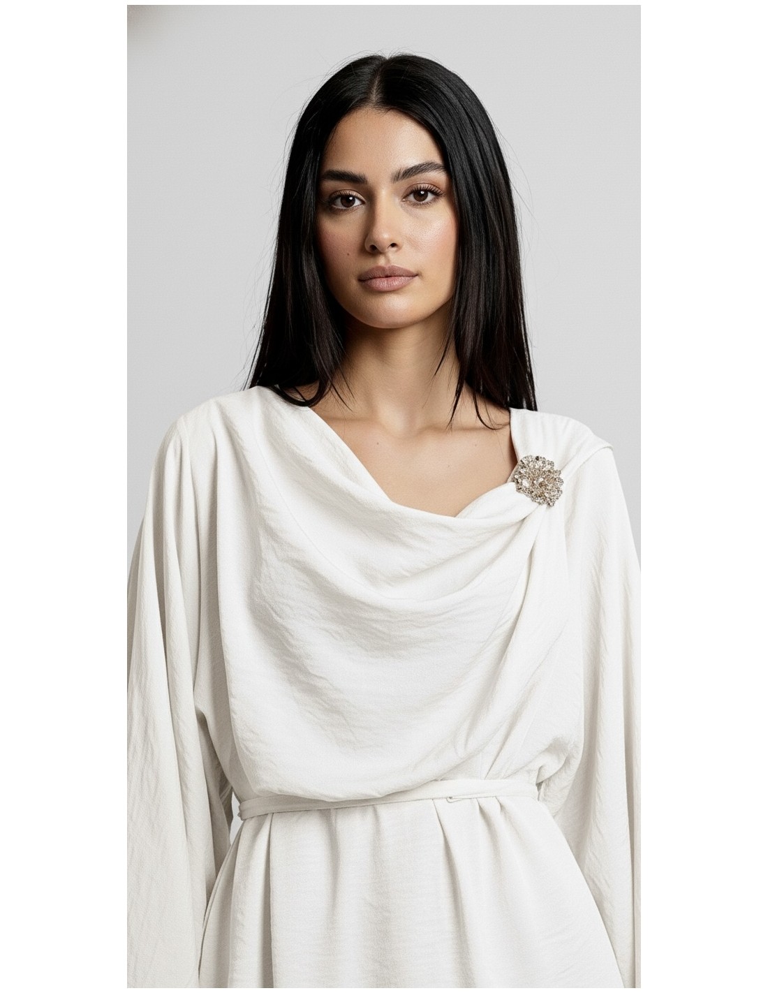 • Haut col drapĂ© style sari, avec broche dĂ©corative dorĂ©e