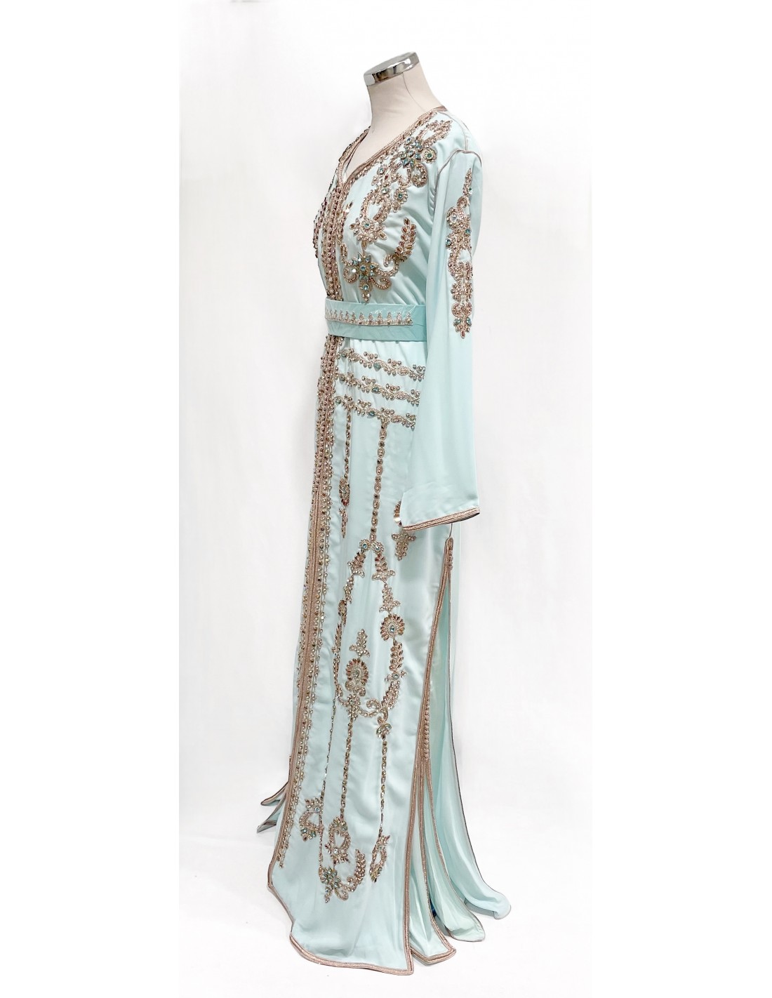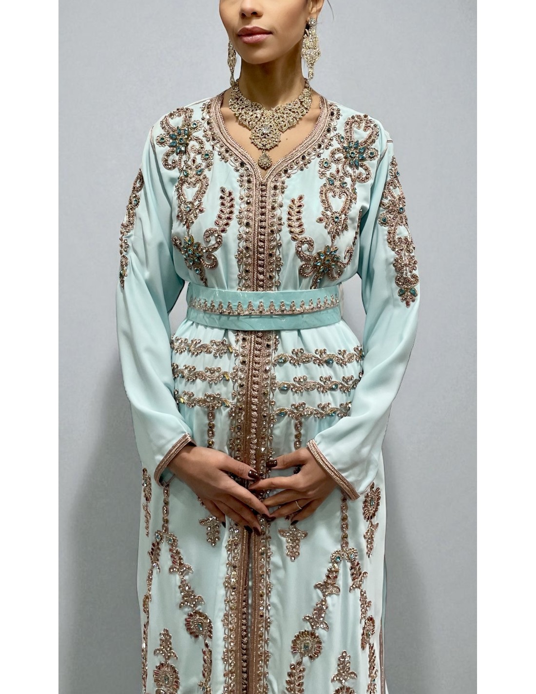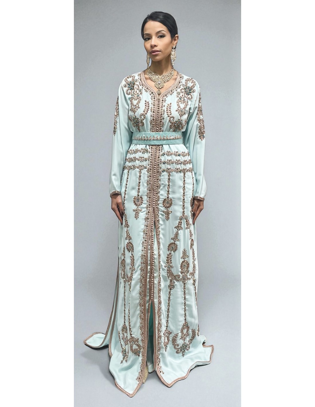 Caftan bleu ciel brodé bronze et turquoise – Robe de cérémonie orientale