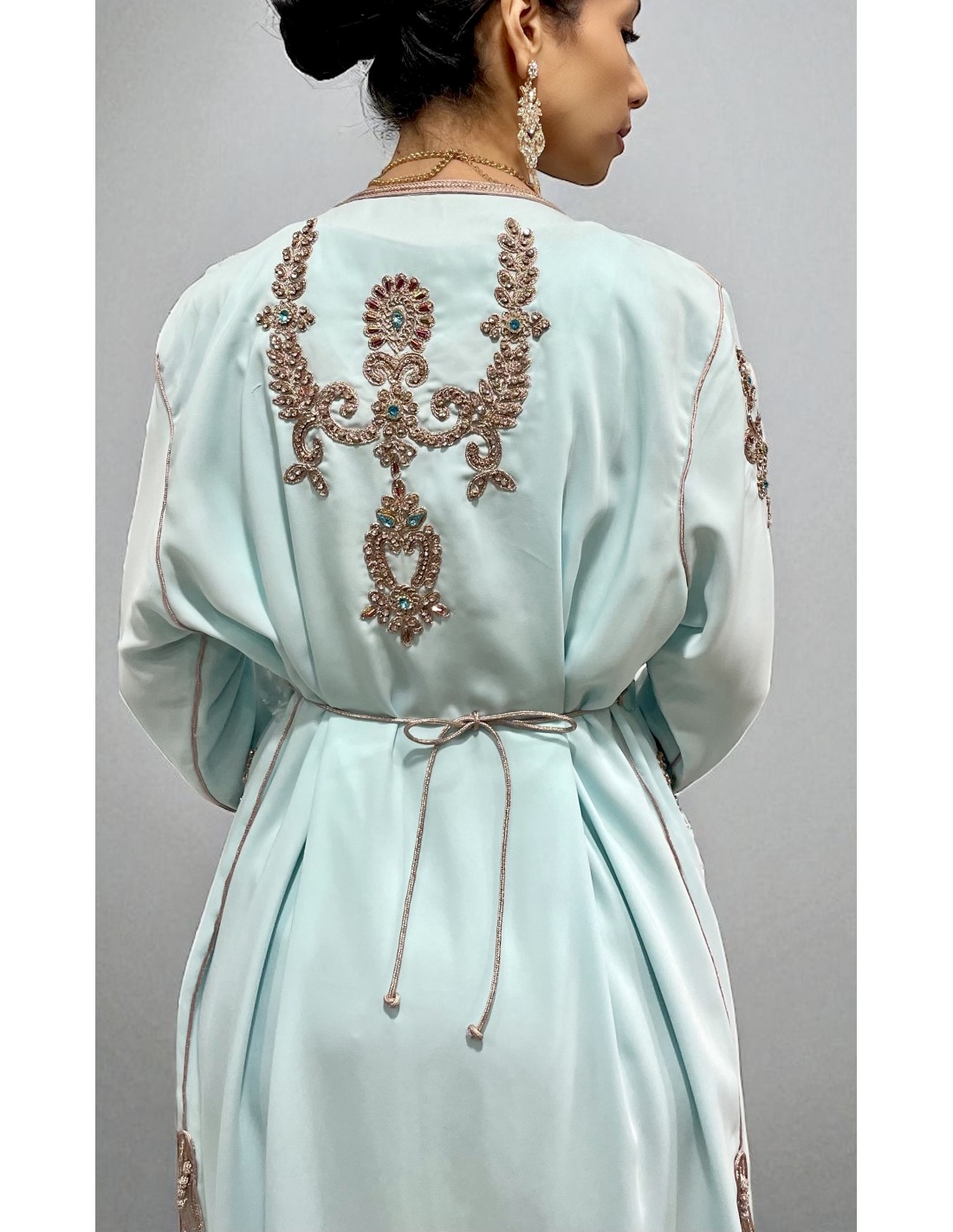 Ce somptueux caftan marocain vert d’eau incarne l’élégance et le raffinement.